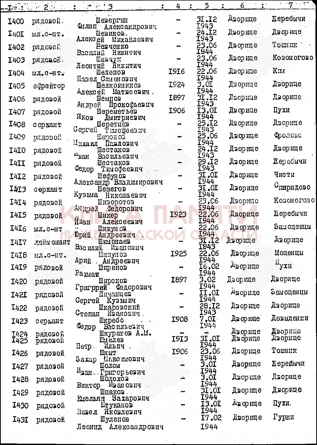 Место захоронения: Белорусская ССР, Витебская обл., Шумилинский р-н, д. Лосвицкая, 500 м восточнее д. Дворище; Белорусская ССР, Витебская обл., Сиротинский р-н, д. Лосвицкая, юго-западнее, 400 м, фр. Мощенцы, северо-западнее, 300 м, ряд 1, братская могила № 152, 2-й слева направо