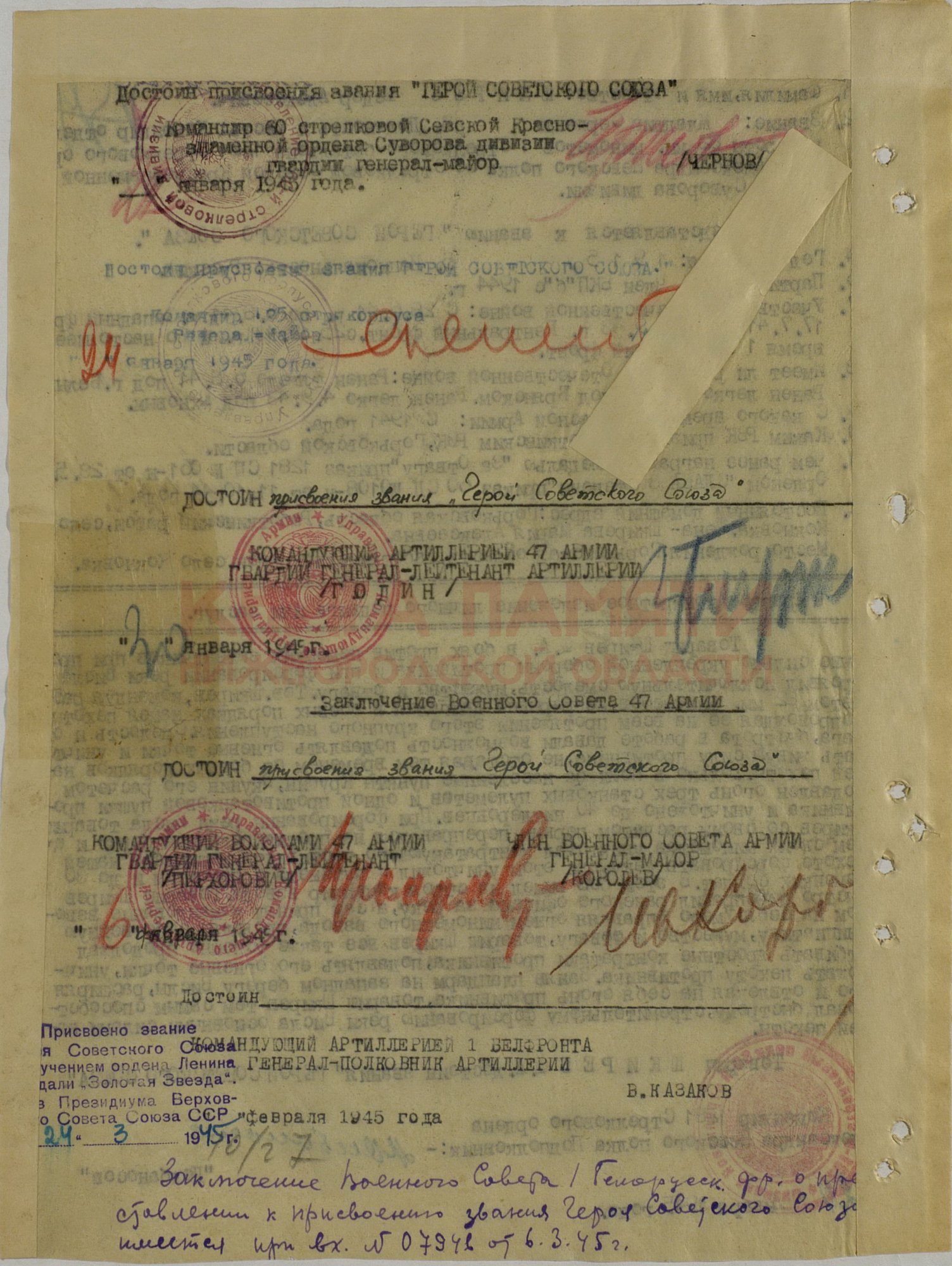 Звание Героя Советского Союза с вручением ордена Ленина и медали «Золотая Звезда».
