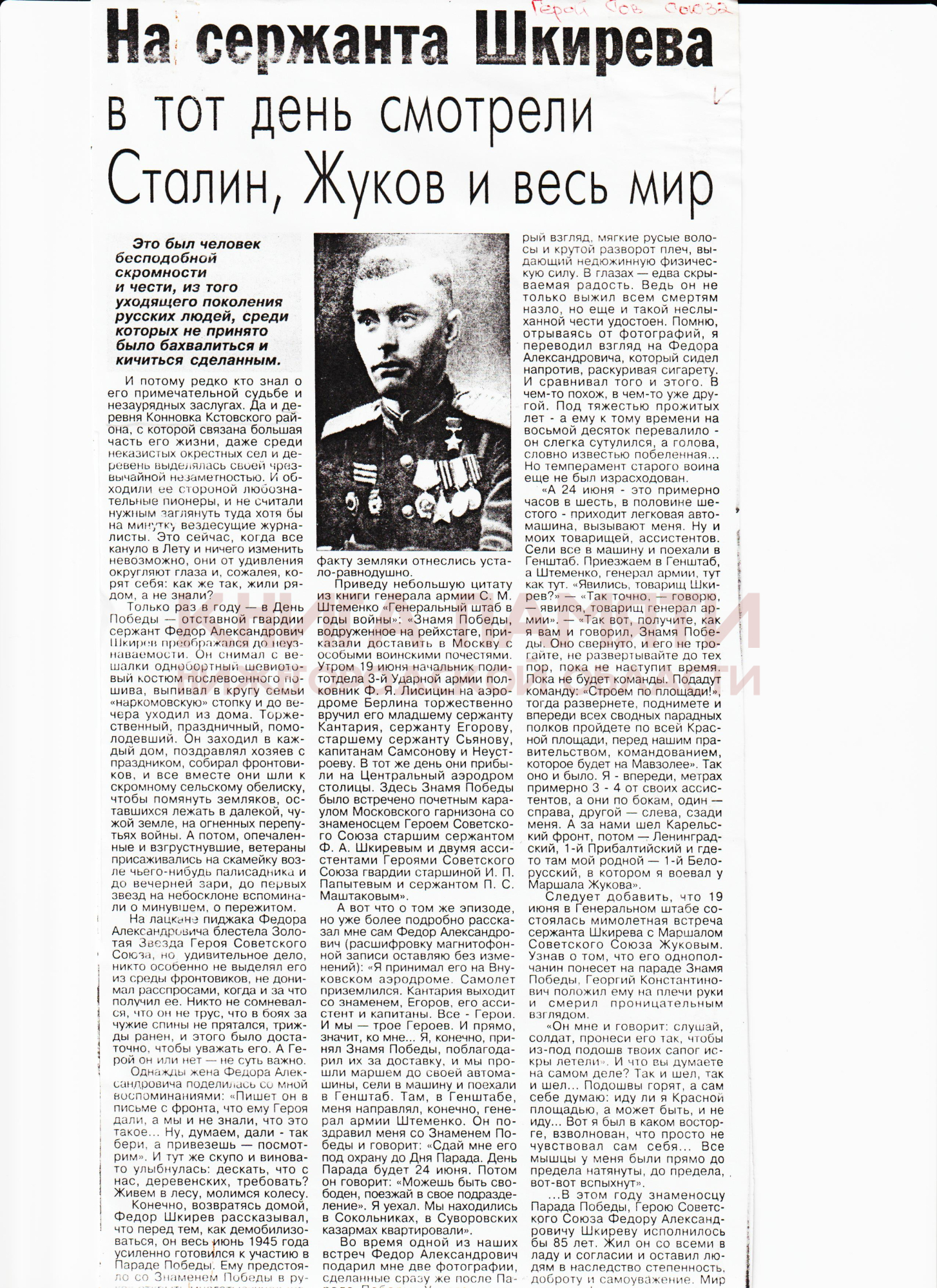 Воевал на Западном, Центральном, 1-м Белорусском фронтах. Принимал участие в Варшавско-Познанской и Висло-Одерской операций. 19 июня 1945 года Герой Советского Союза старший сержант Ф. А. Шкирёв в составе почётного караула Московского гарнизона в сопровождении двух ассистентов встретил Знамя Победы на Центральном аэродроме имени Фрунзе в Москве. 24 июня 1945 года участвовал в историческом Параде Победы на Красной площади.