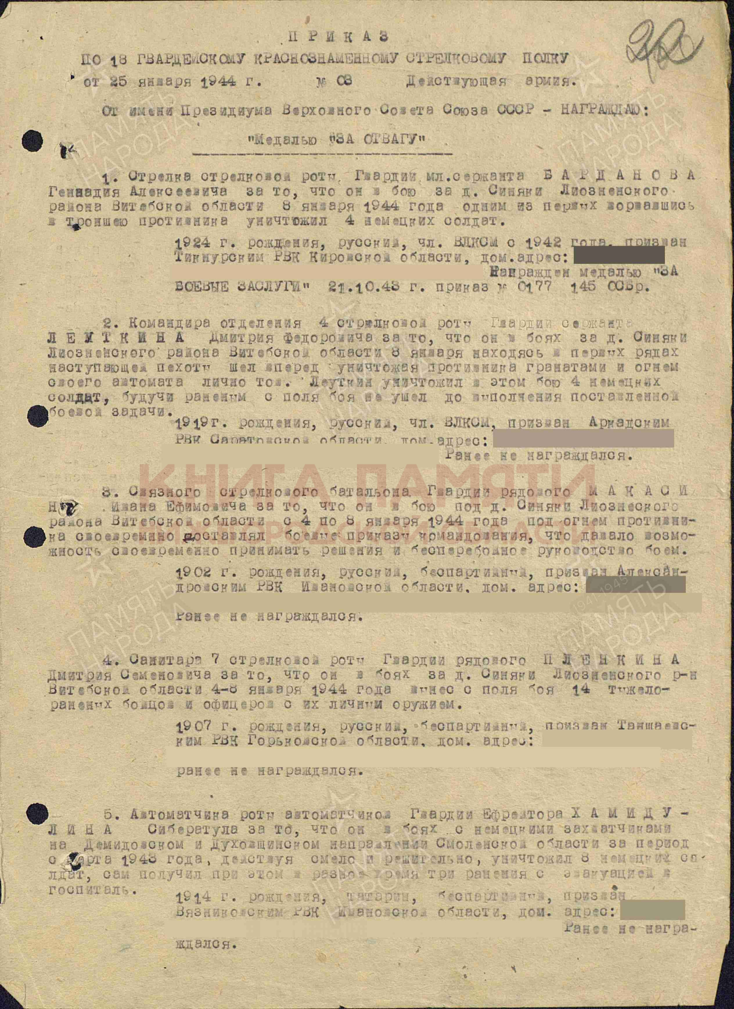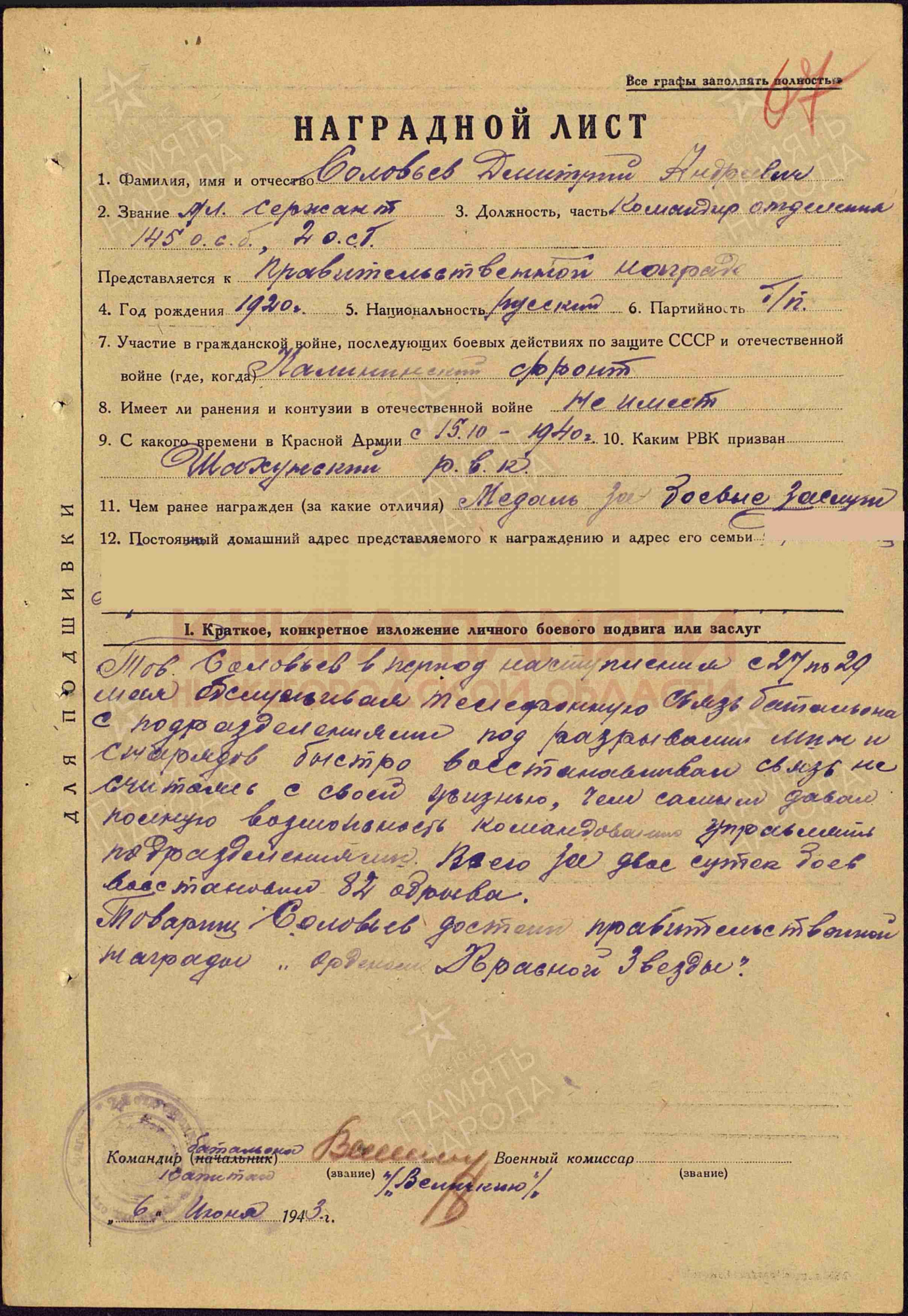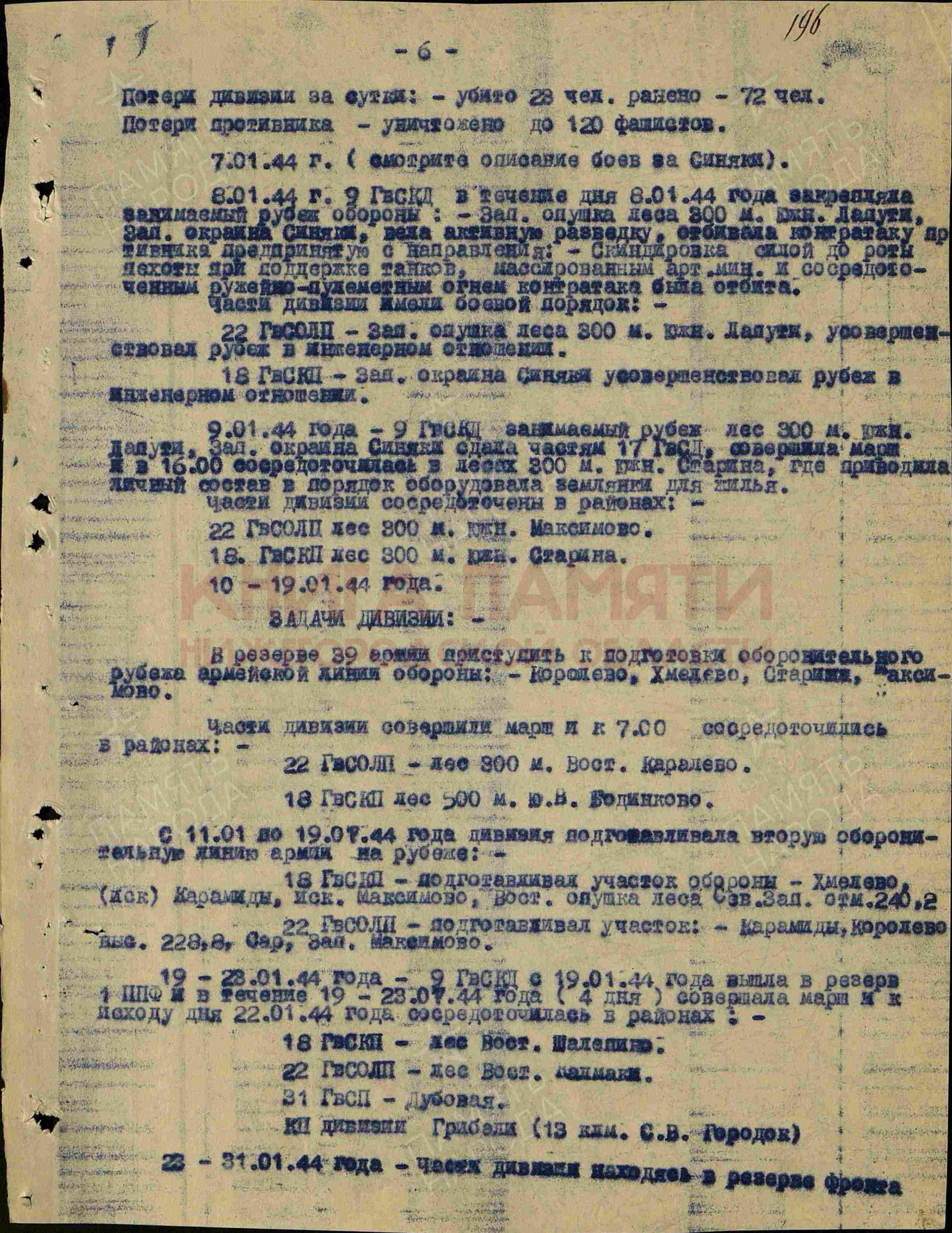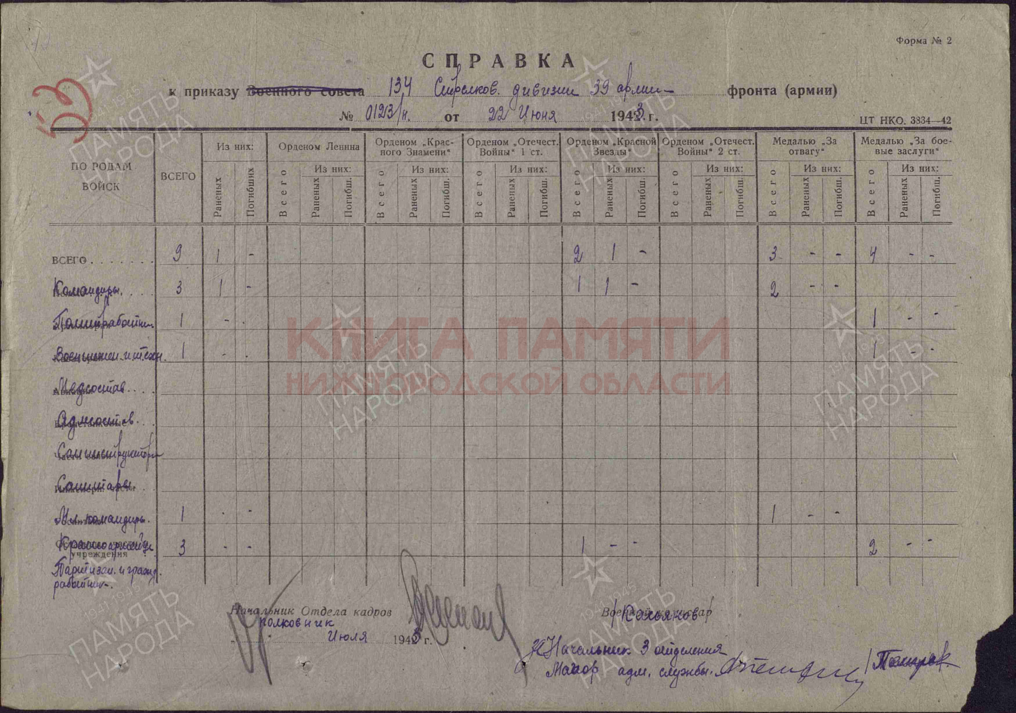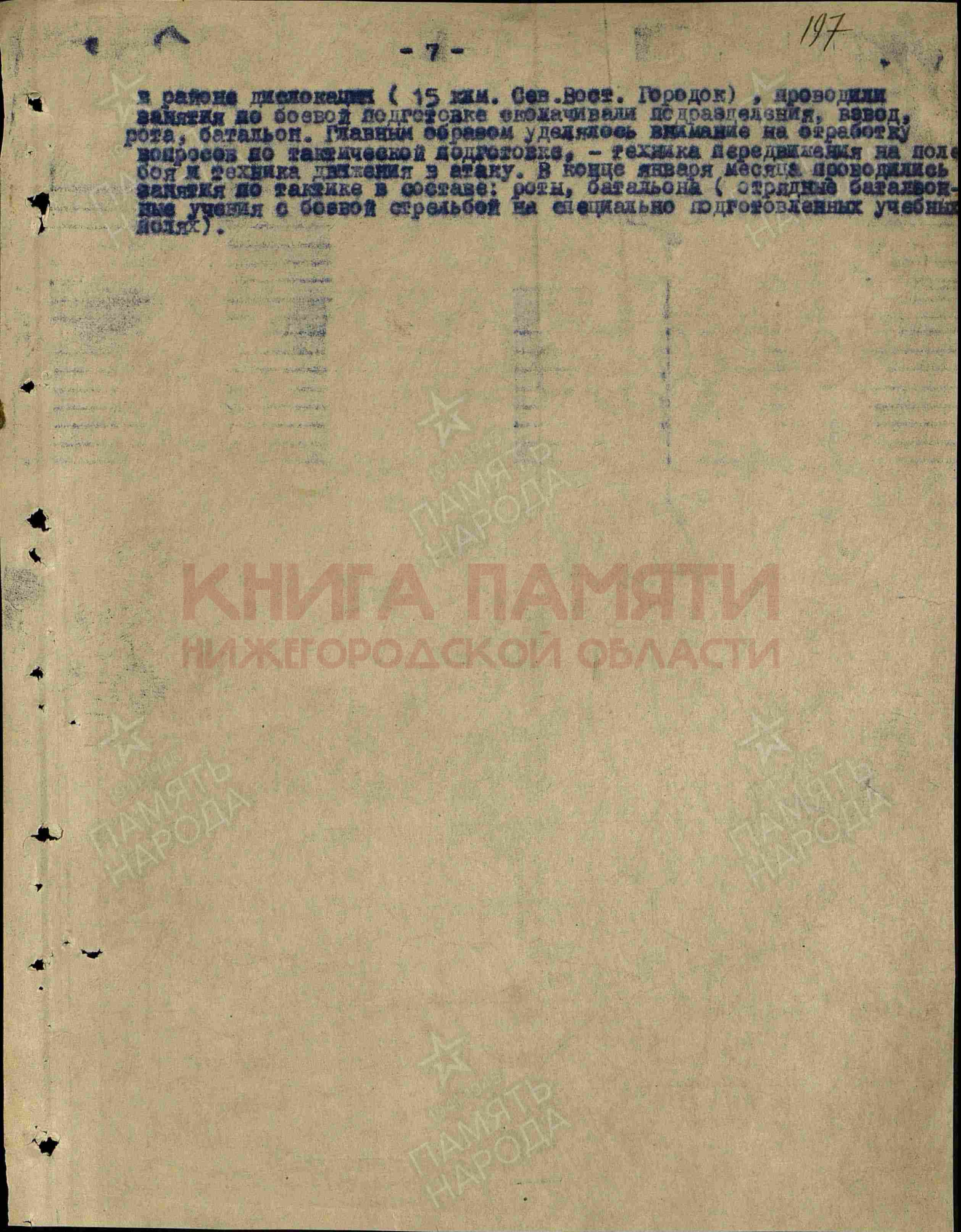 Последнее место службы: 52 стрелковый полк, Дата выбытия: 13.06.1945, выбыл из госпиталя, Госпиталь: ЭГ 4001