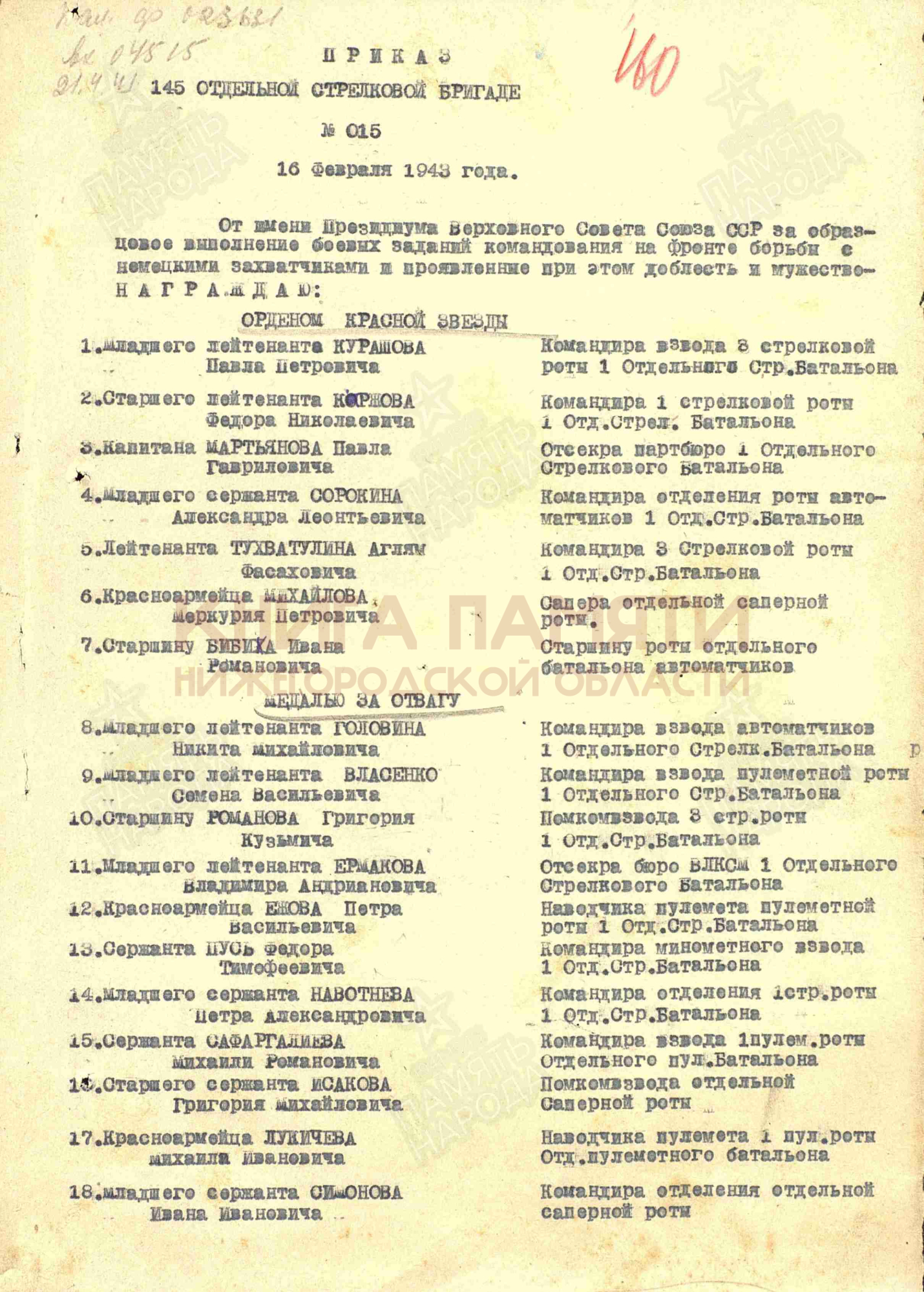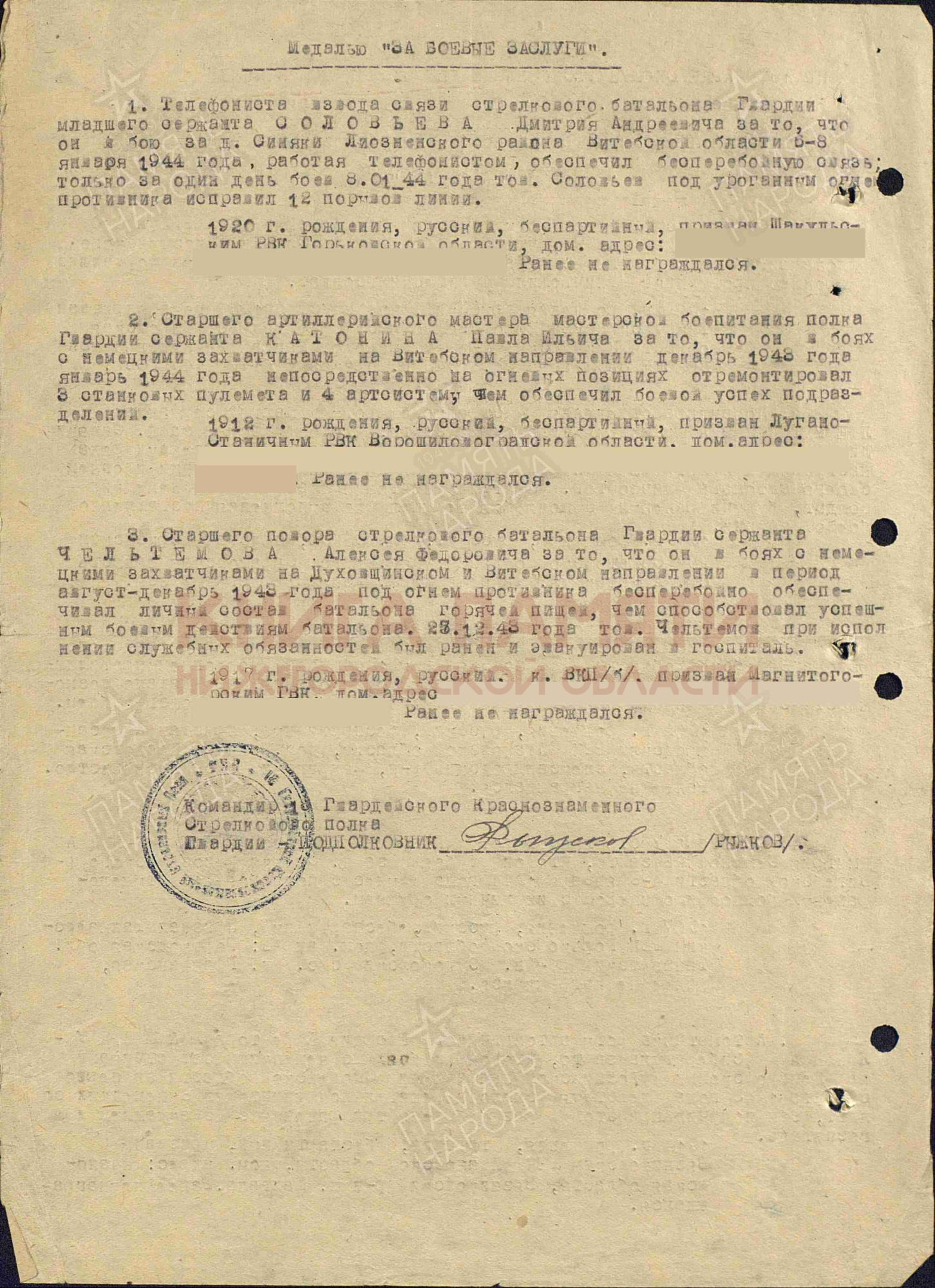 Последнее место службы; 52 стрелковый полк 17 гвардейской стрелковой дивизии.145 стрелковая бригада; 18 гвардейский стрелковый полк 9 гвардейской стрелковой дивизии