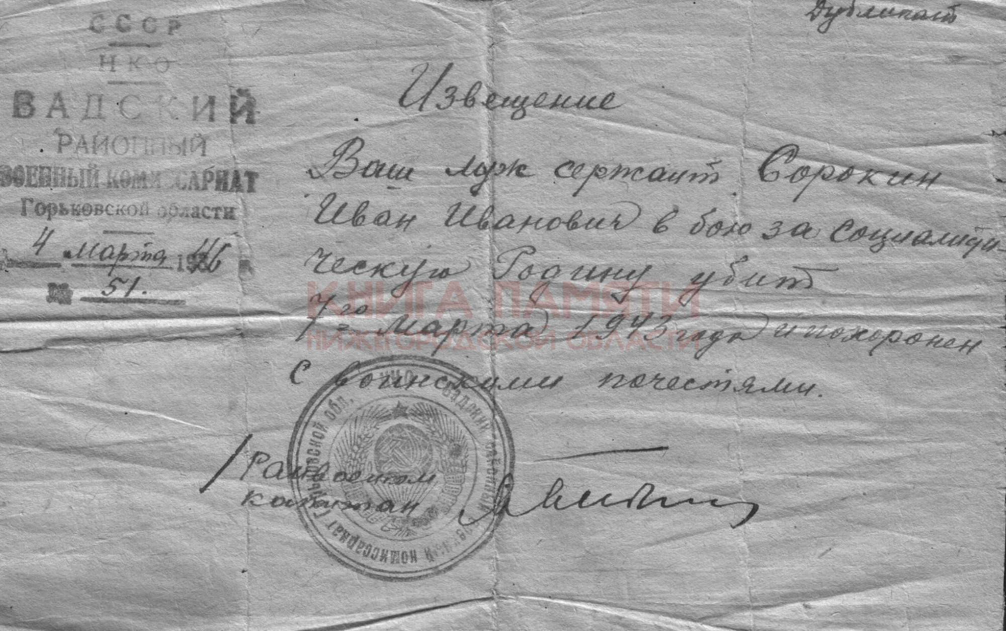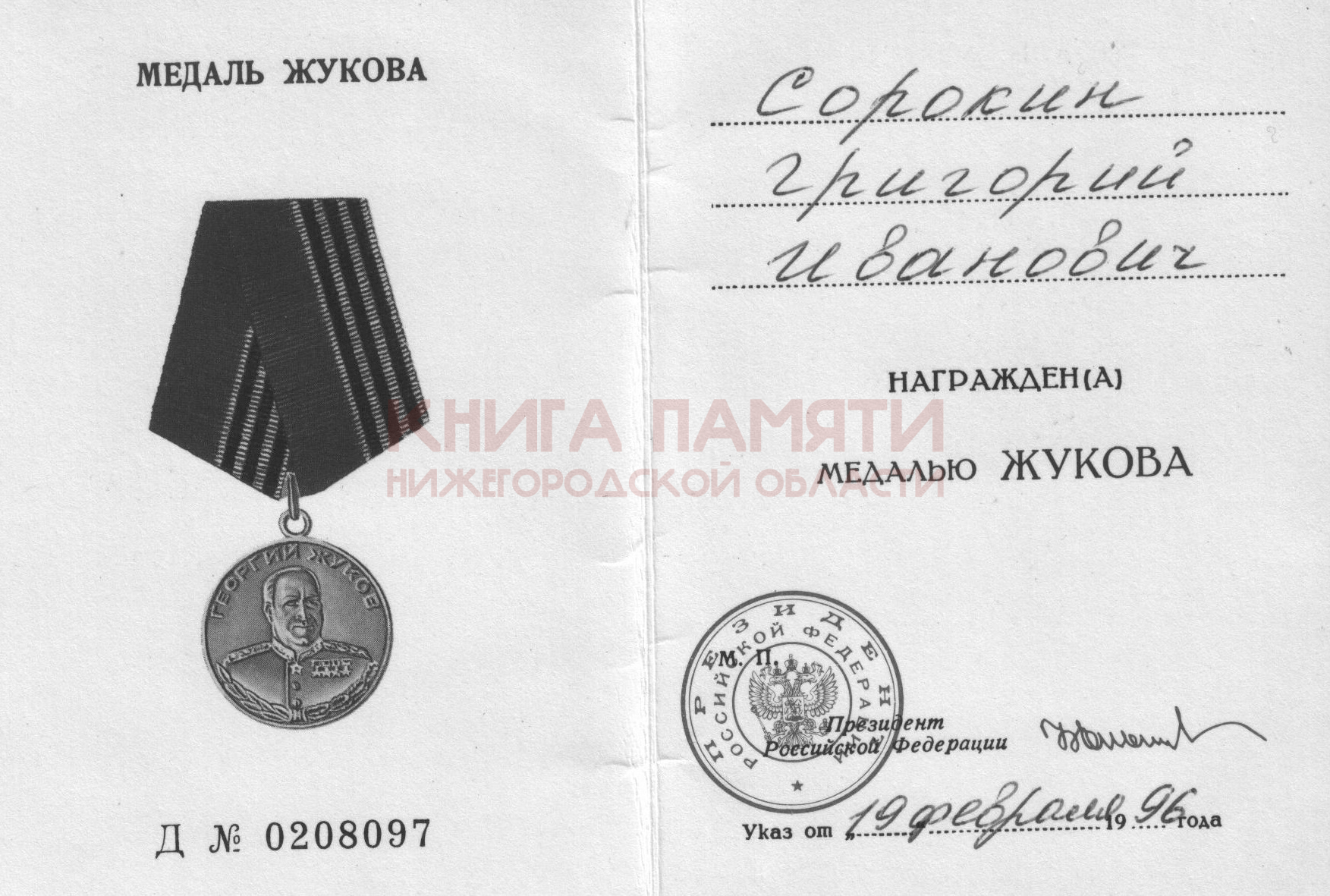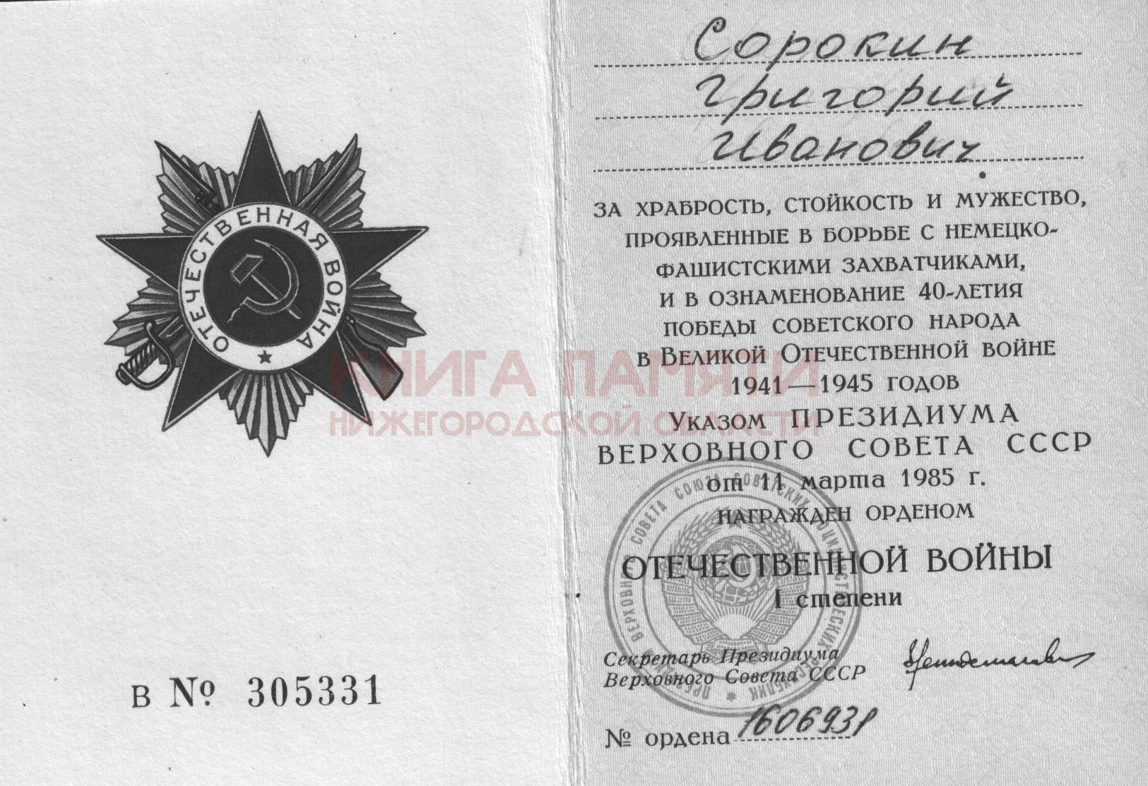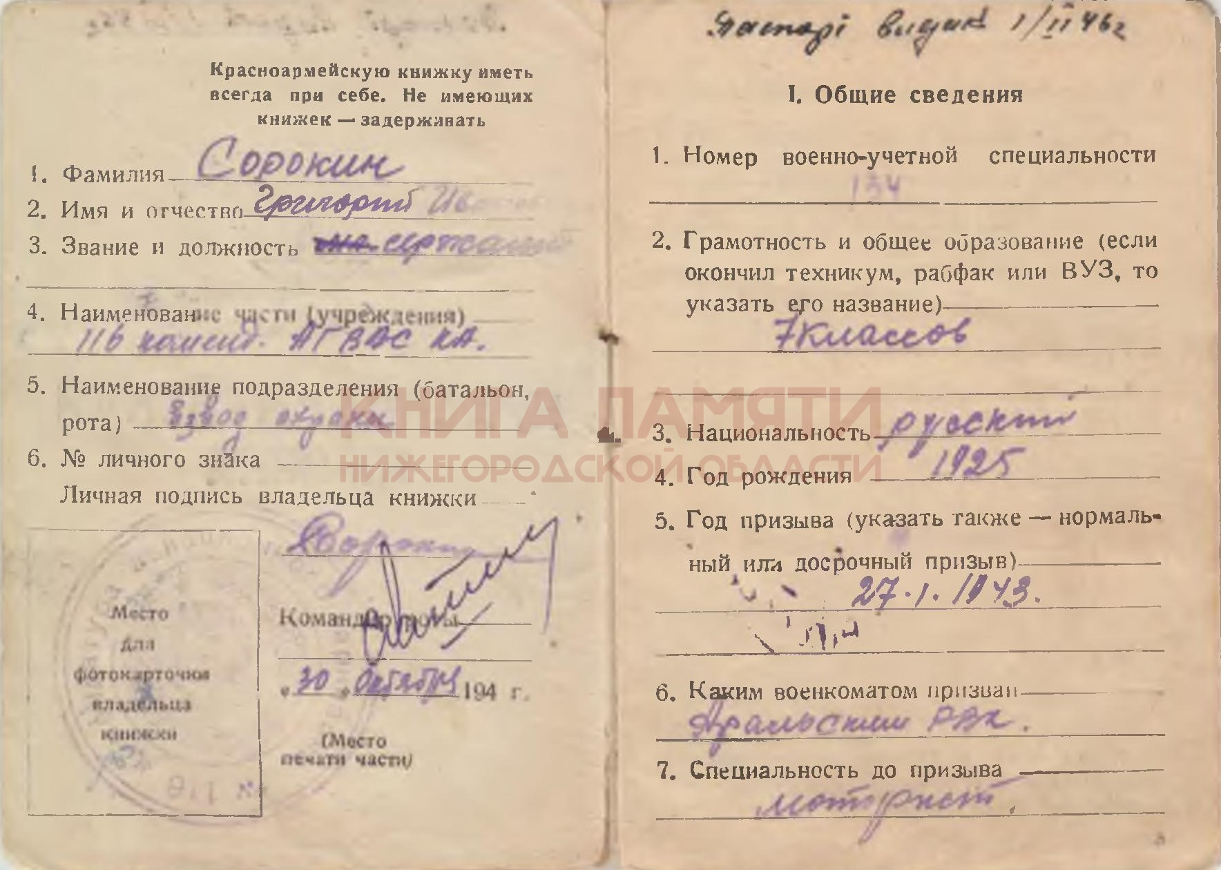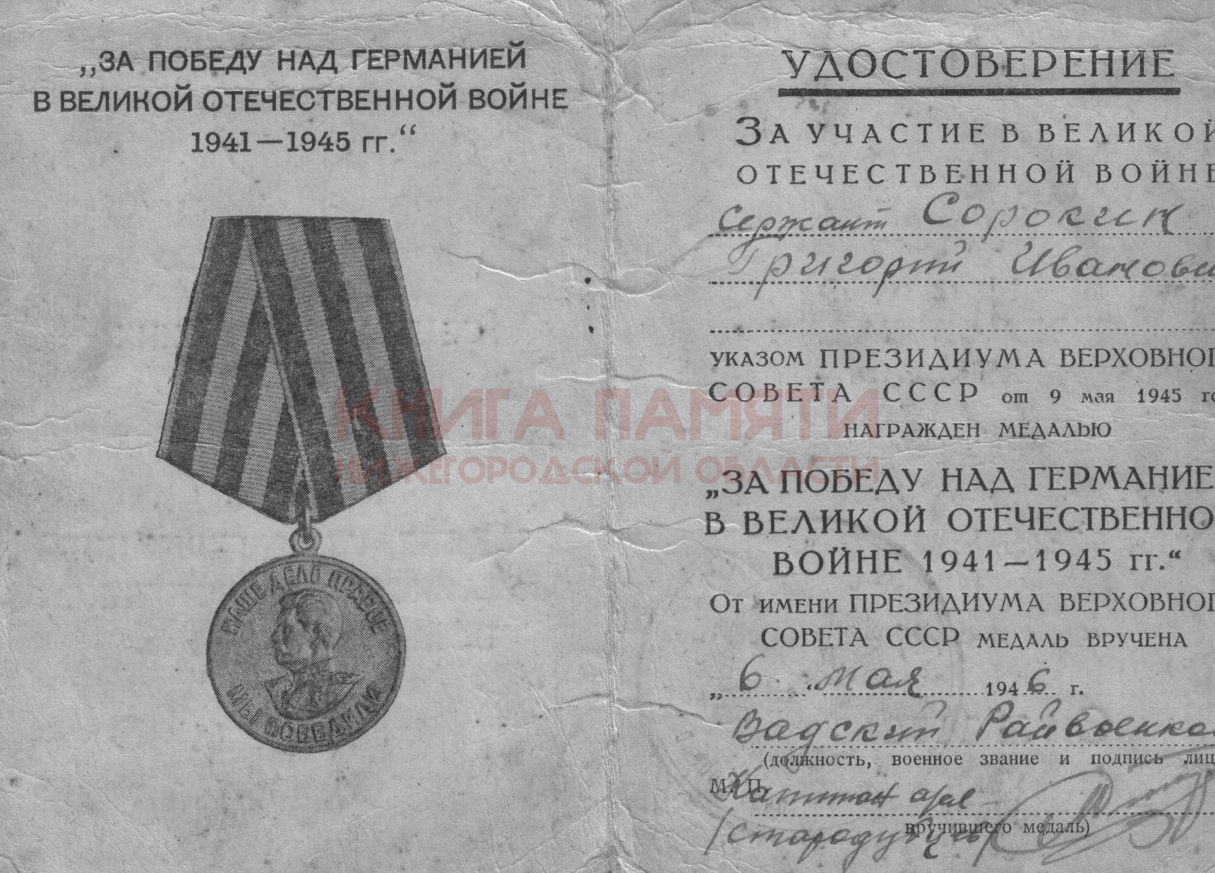 Сорокин Григорий Иванович родился 10 января 1925г в с. Вад Вадского района Горьковской области в семье крестьян Сорокина Ивана Ивановича 1900г. рожд. и Сорокиной Екатерины Васильевны 1900г. рожд.