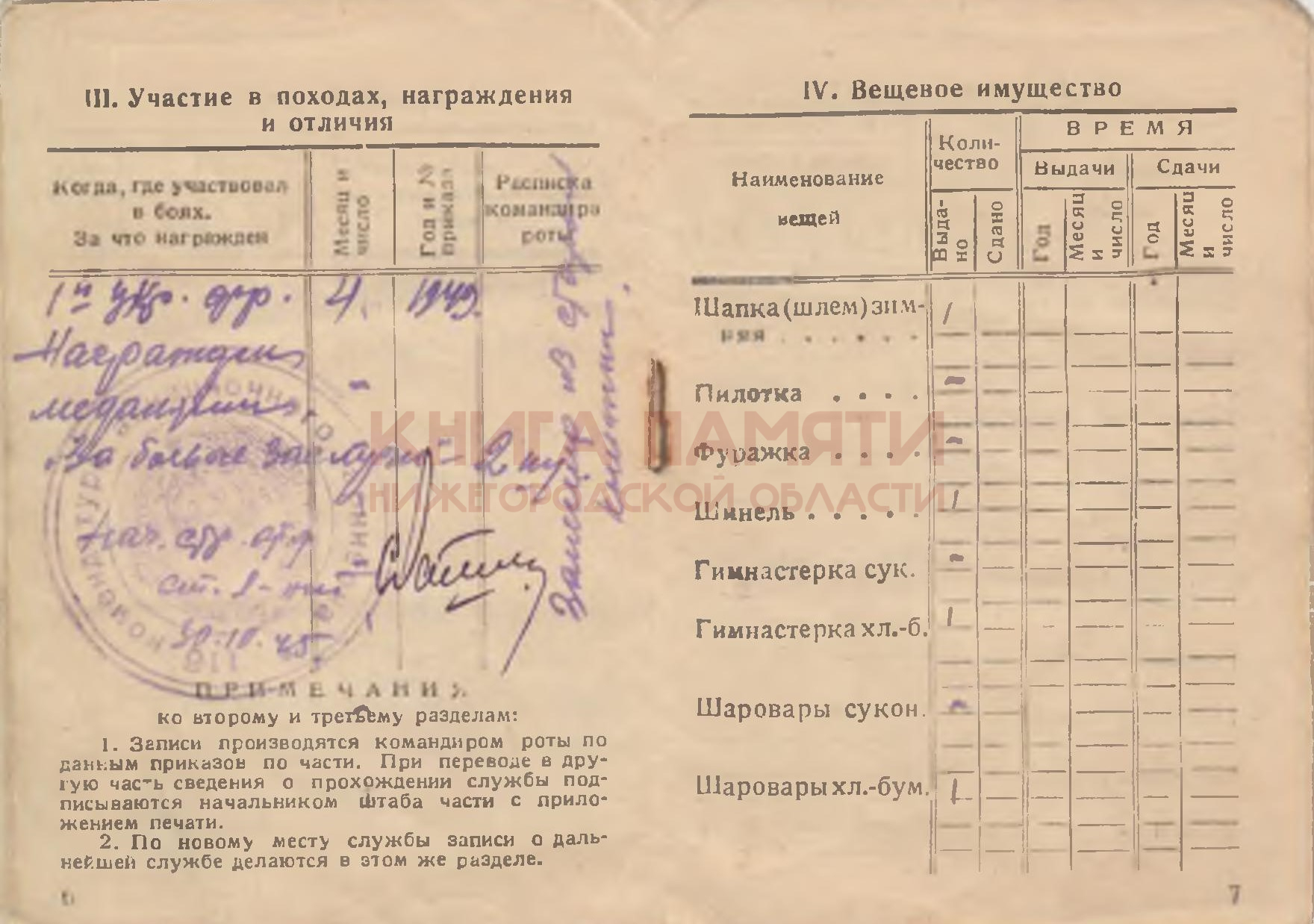 В 1941г. закончил 7 классов Вадской средней школы. До призыва в армию работал в колхозе «Родина». 27 января 1943г. был мобилизован в ряды армии и направлен на учёбу в Ашхабатское военное пехотное училище на младшего командира. 23 апреля 1943г. в звании сержанта зачислен в состав второй батареи истребительного противотанкового полка второго Украинского фронта. В последствии участвовал в боях по форсированию рек Днепр и Днестр, в битве на Курской дуге, по освобождению городов Украины, Польши, Румынии, Молдавии, Чехословакии, Германии. 16 апреля 1945г. в бою под г. Дрезден тяжело ранен в голову. Демобилизовался в октябре 1945г. Вернулся домой. В феврале 1946г. женился на Савиновой Евдокии Васильевне. Закончил в 1948г. Ардатовскую школу механизации сельского хозяйства Горьковской области. Работал начальником караула на аэродроме с.Лопатино, в МТС мотористом, в СХТ комбайнером, бригадиром, неоднократно избирался народным заседателем в районный суд. В 1988г. вышел на пенсию. С женой прожил совместно 52 года имели 2 детей : сына Сергея и дочь Надежду. Умер в 2003г.