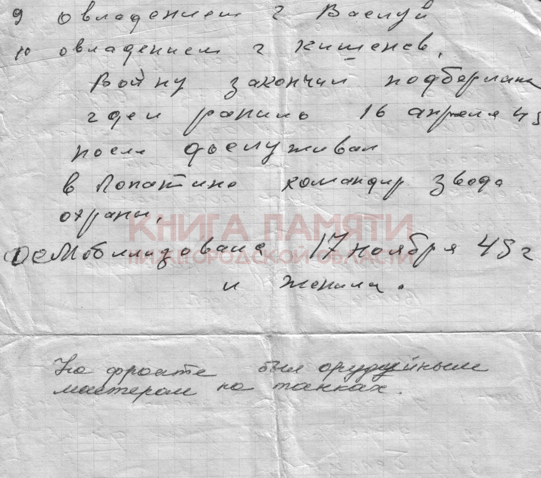Не найдя героя, командование переслало орден по домашнему адресу матери. Вместе с наградой были высланы 500 руб. Мать поняла так, что Гриша погиб. Оплакала его, как мужа и другого сына. А осенью сорок пятого