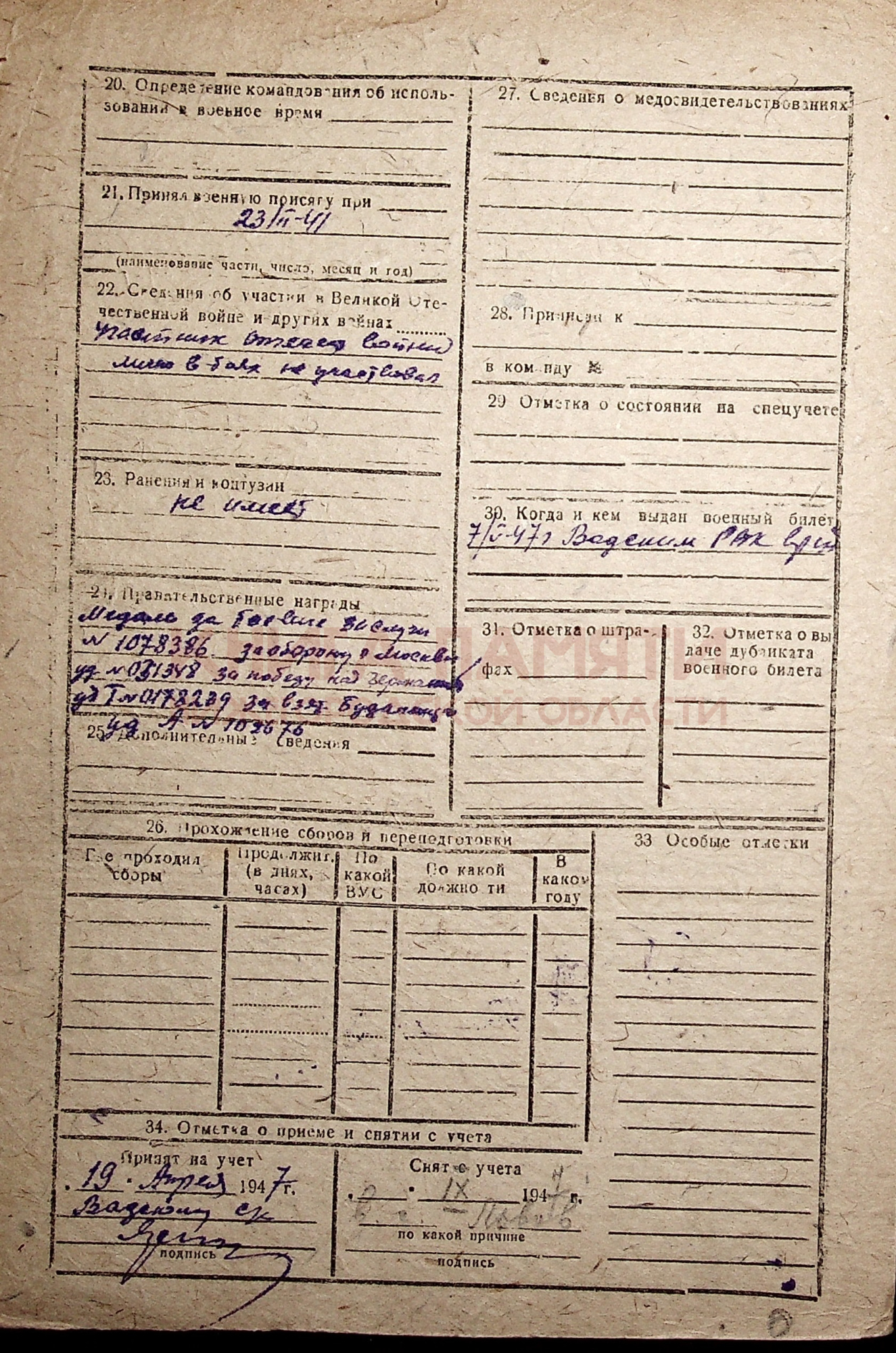 Медаль «За боевые заслуги» Медаль «За оборону Москвы», Медаль «За взятие Будапешта», Медаль «За взятие Вены», Медаль «За победу над Германией в Великой Отечественной войне 1941–1945 гг.»