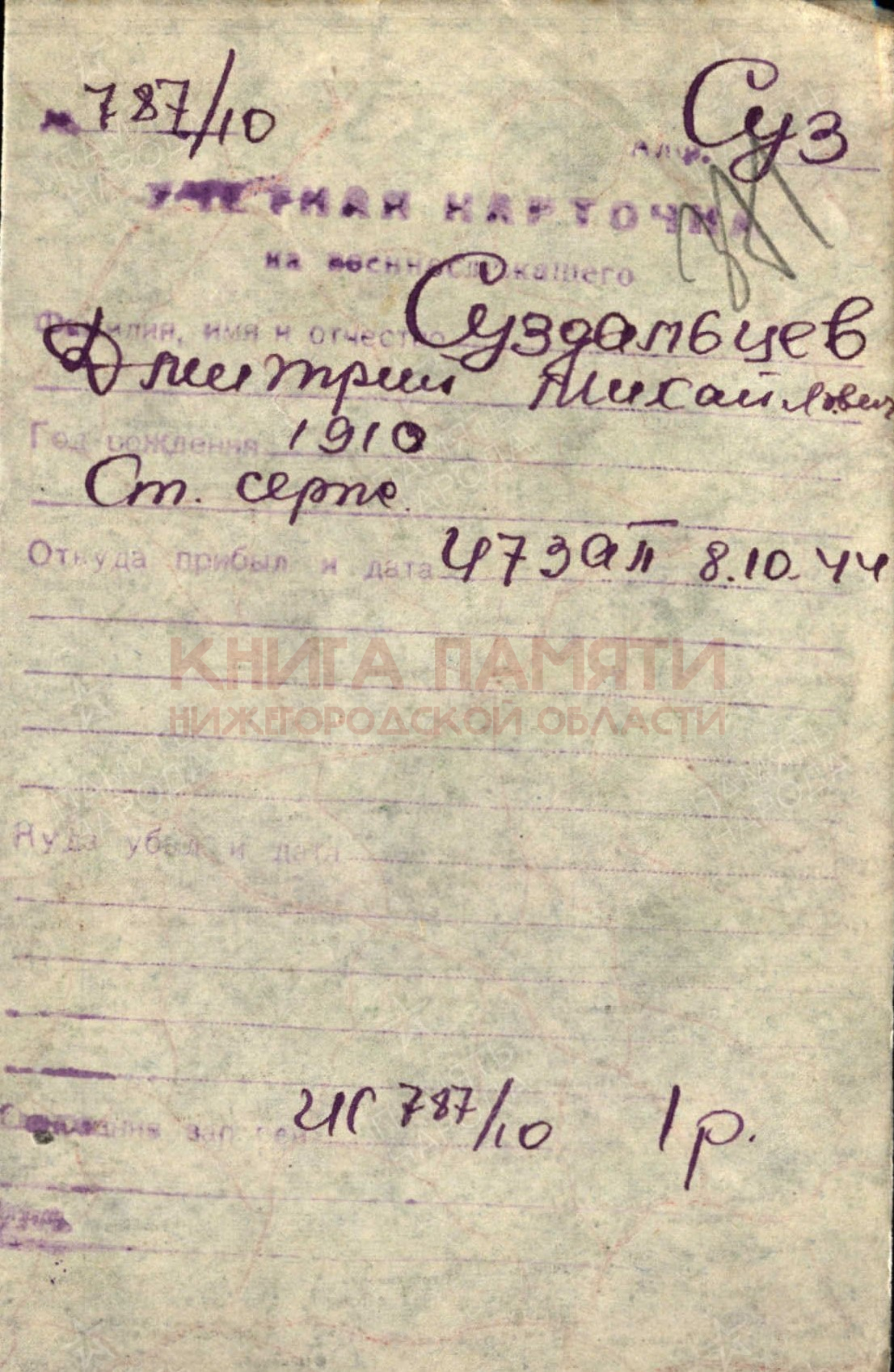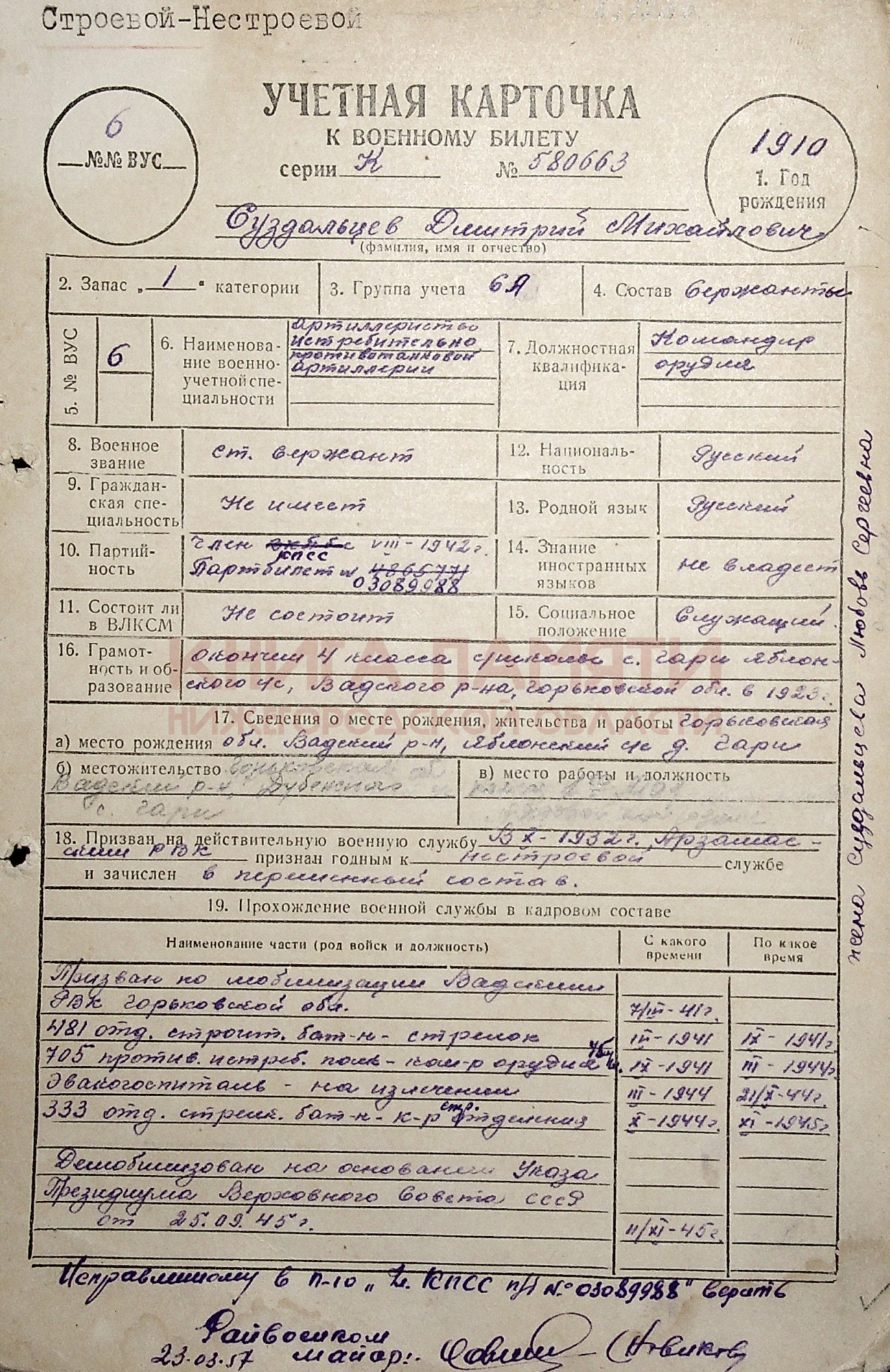Весь артиллерийский расчет старшего сержанта Суздальцева за участие в прорыве блокады был представлен к орденам и медалям. И все члены расчета, кроме командира, их получили. А на Суздальцева аттестация пошла выше дивизии. Но в жаркое время не все удостаивались заслуженного. Случалось, что в штабы попадали вражеские бомбы и уничтожали все документы, в том числе и аттестации на большие награды. Может, так и сталось с наградными документами командира расчета 45-ти миллиметров. Но главным в те решающие дни для советских людей было неполучение орденов и звездочек. А любыми путями добыть желанную победу. И она пришла и пусть незначительная доля в ее осуществлении, но есть и со стороны защитника города Ленина, жители села Гари.