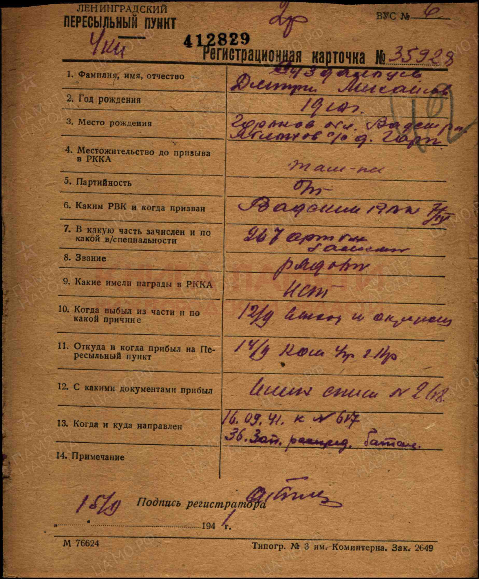 Дмитрий Михайлович оказался в минометном подразделении связистом. Первое ранение, в ногу. Предлагали направить в госпиталь – отказался. Лечил батальонный санитар, в окопах. Луга, Гатчина, Пушкино... Вот те места, где приходилось принимать на себя минометчикам удары врага, а связистам - в трудных условиях налаживать связь между подразделениями.
