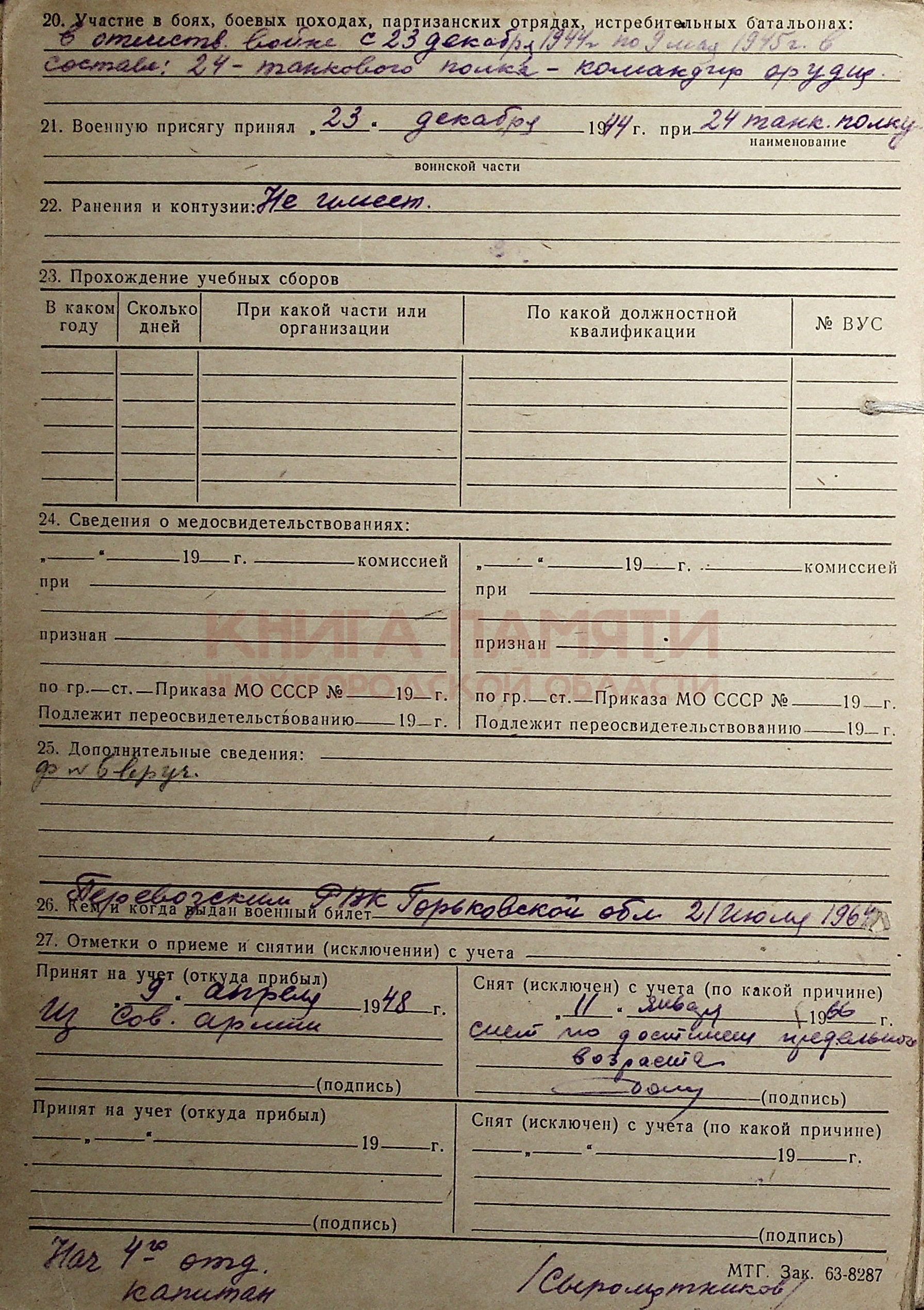 Демобилизован на основании Указа Президиума Верховного Совета СССР от 25.09.1945 с 13.11.1945
