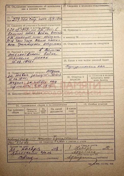 Тяжело ранен 15.08.1943 г. Находился в ЭГ в г. Великие Луки на излечении с 15.08.1943 г. - 10.10.1943 г.