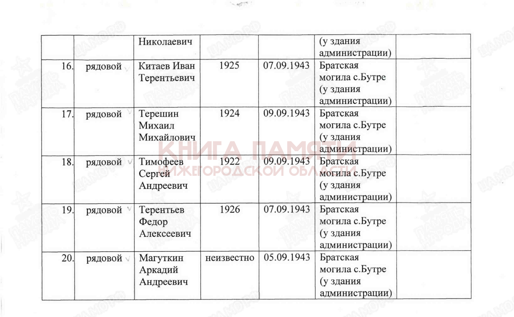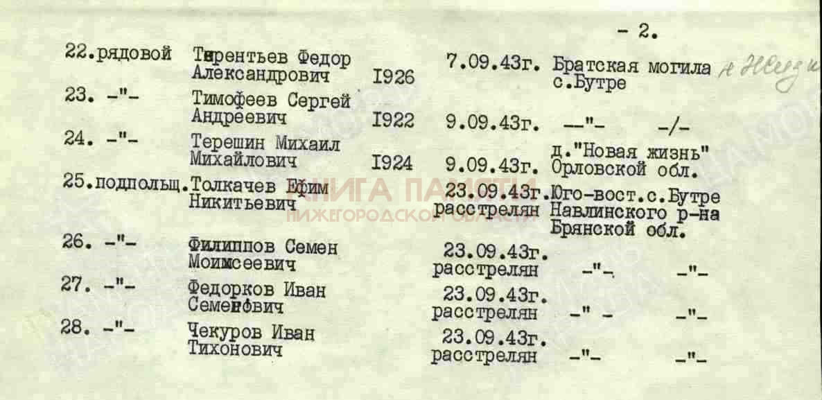 Похоронен: Навлинский р-н, с. Бутре, у задания администрации, братская могила ;
