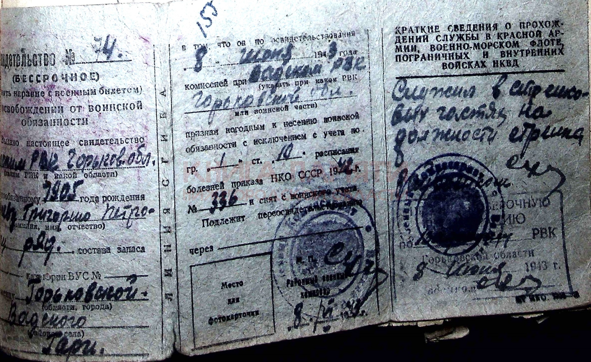 08.06.1943 г. признан негодным к несению воинской обязанности с исключением с учета.