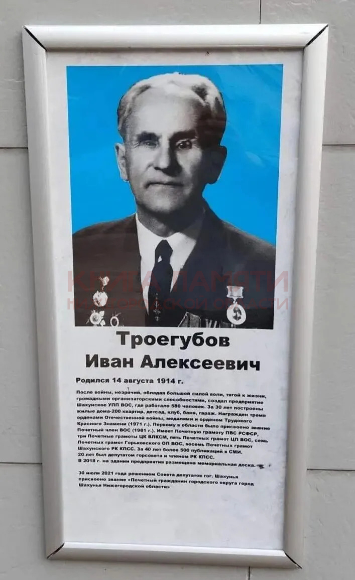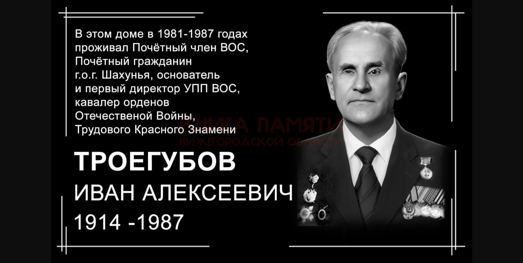 Почетный гражданин г.о.г. Шахунья , Почетный член ВОС, фронтовик, основатель и первый директор Шахунского УПП ВОС.А. Троегубов имел пять Почетных грамот ЦП ВОС, семь Почетных грамот Горьковского областного правления ВОС, три Почетные грамоты ЦК ВЛКСМ, восемь Почетных грамот Шахунского РК КПСС, неоднократно награждался почетными грамотами ДОСААФ, ВООПИК, Латвийской ССР. Его имя занесено в Нижегородскую биографическую энциклопедию Ссылка: https://www.names52.ru/t/tpost/262r2b0ek1-troegubov-ivan-alekseevich