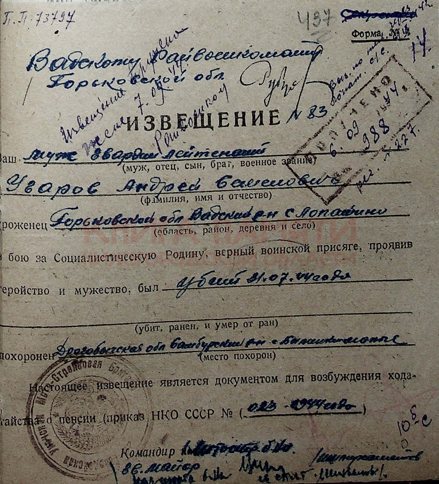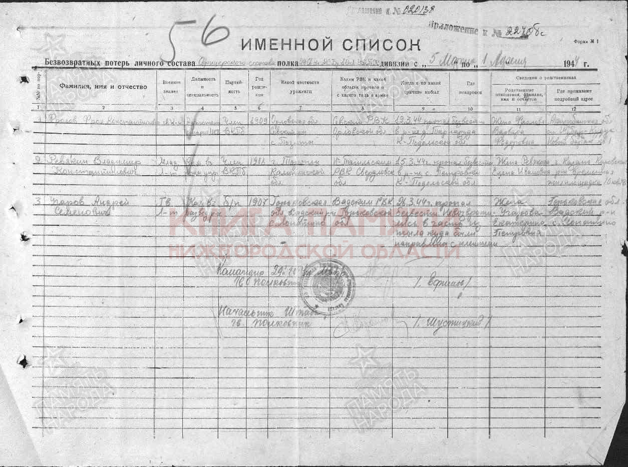Погиб в бою 31 июля 1944 г. Место захоронения Украина, Львовская обл., Дрогобычский р-н, д. Былинка