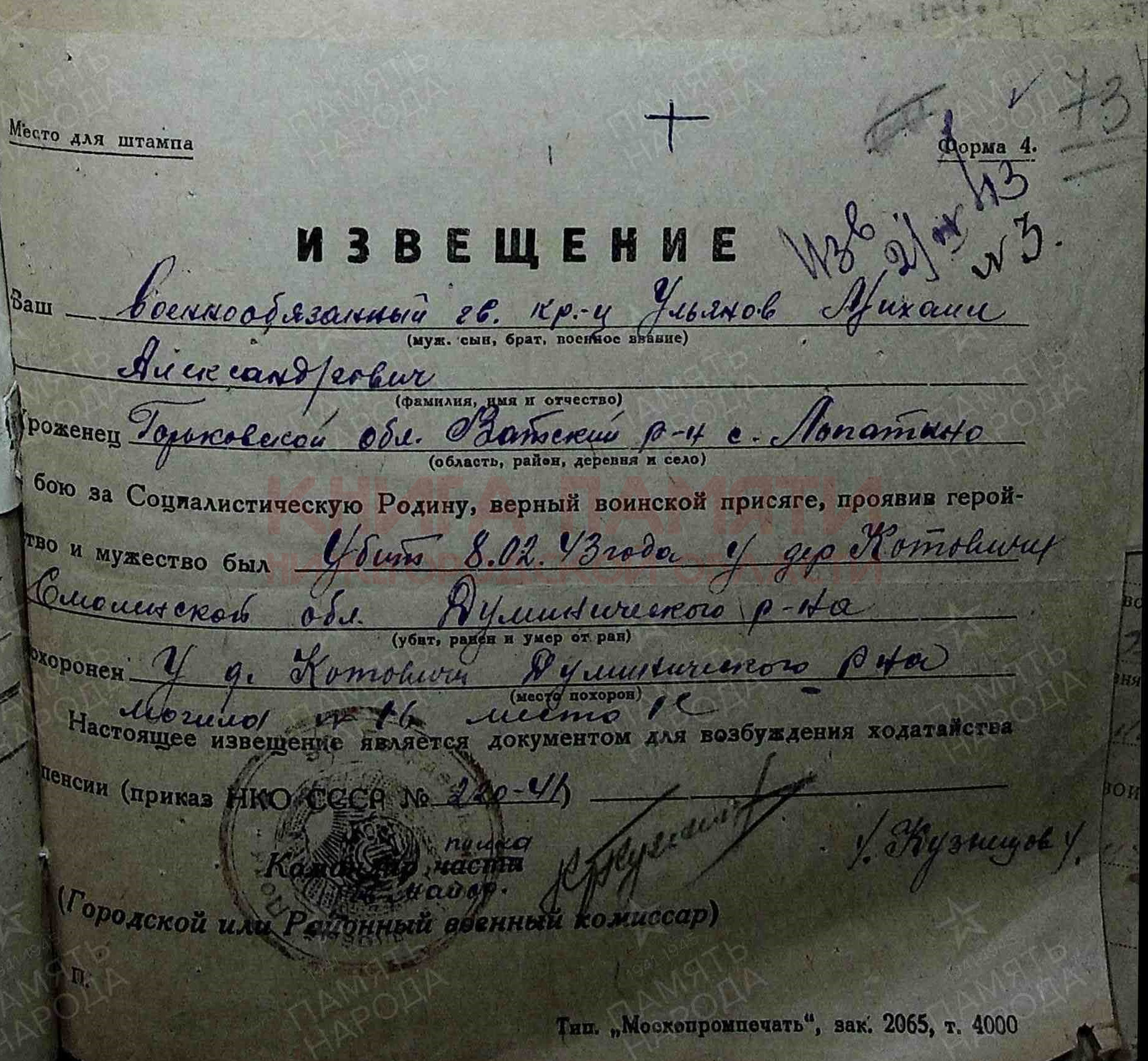 Погиб в бою 8 февр. 1943 д. Котовичи Думиничского р-на Калужской обл.