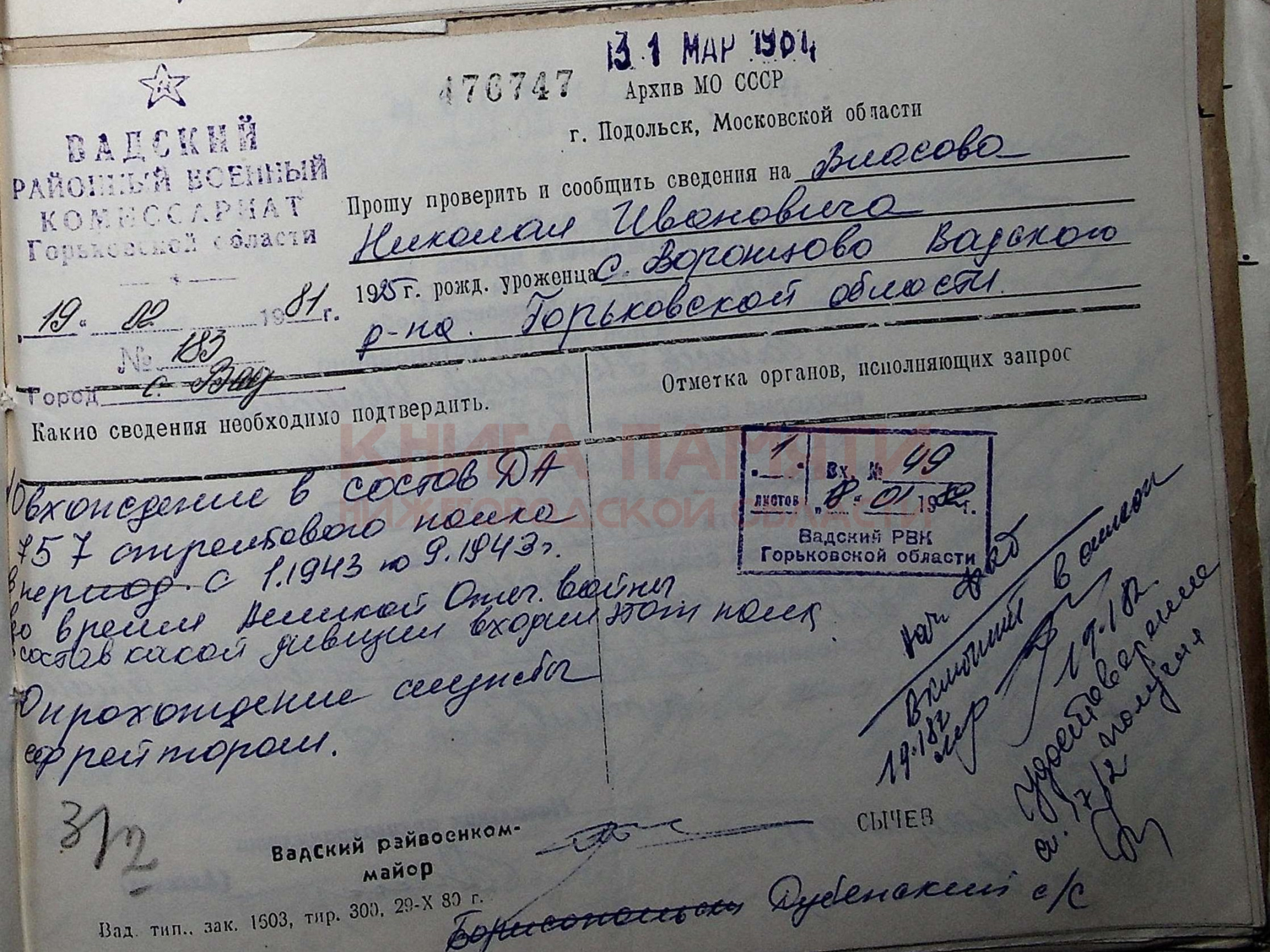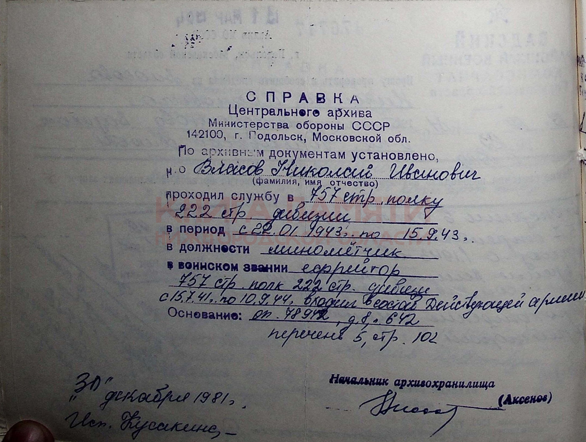 Тяжело ранен в правую руку 16.09.1943 г. Дата свидетельства: 02.01.1944 г. Умер 10.12.1995 г.