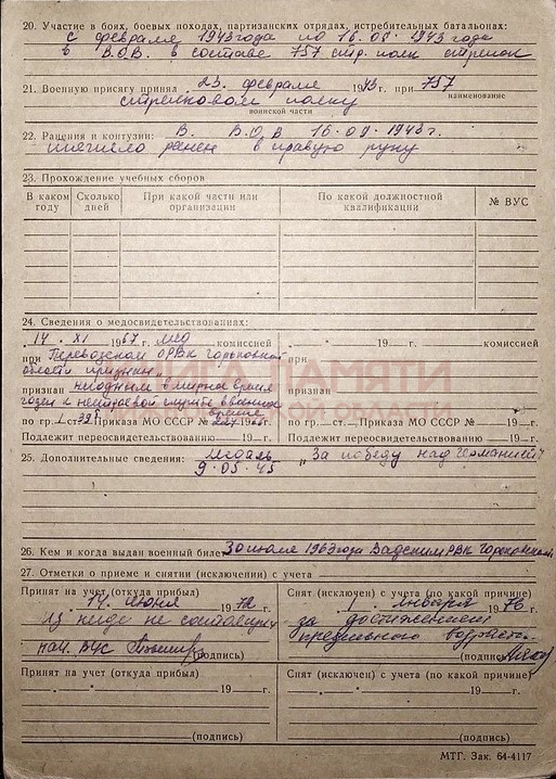 Не годен к строевой службе по ранению от 07.01.1944 г.