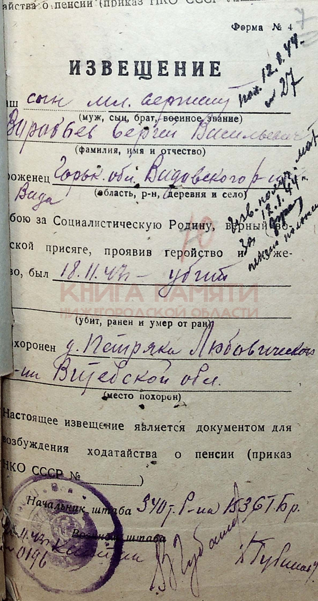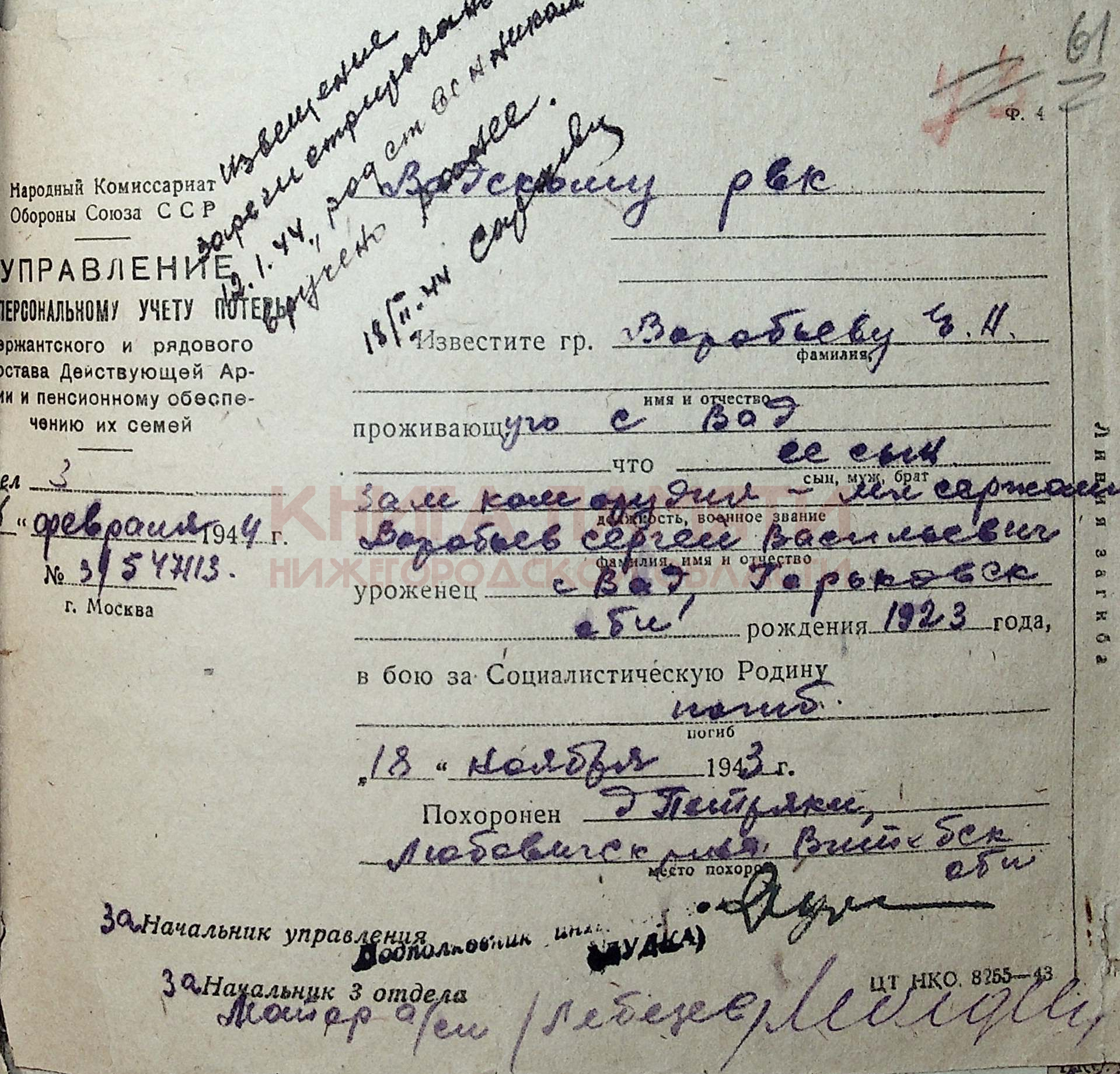Погиб в бою 18.11.1943 г.