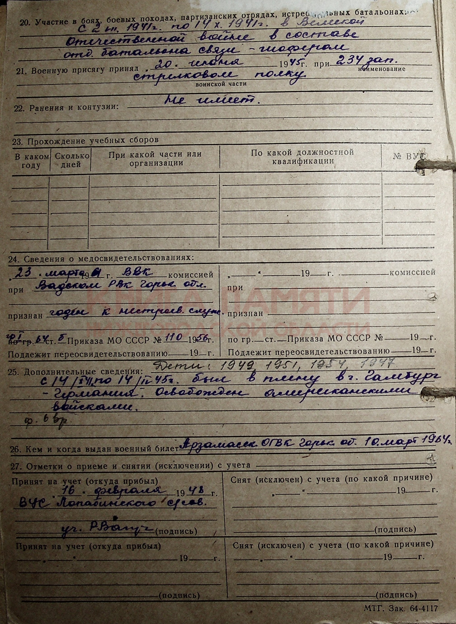 С 14.10.1941 по 14.04.1945 г. был в плену в г. Гамбург Германия.
