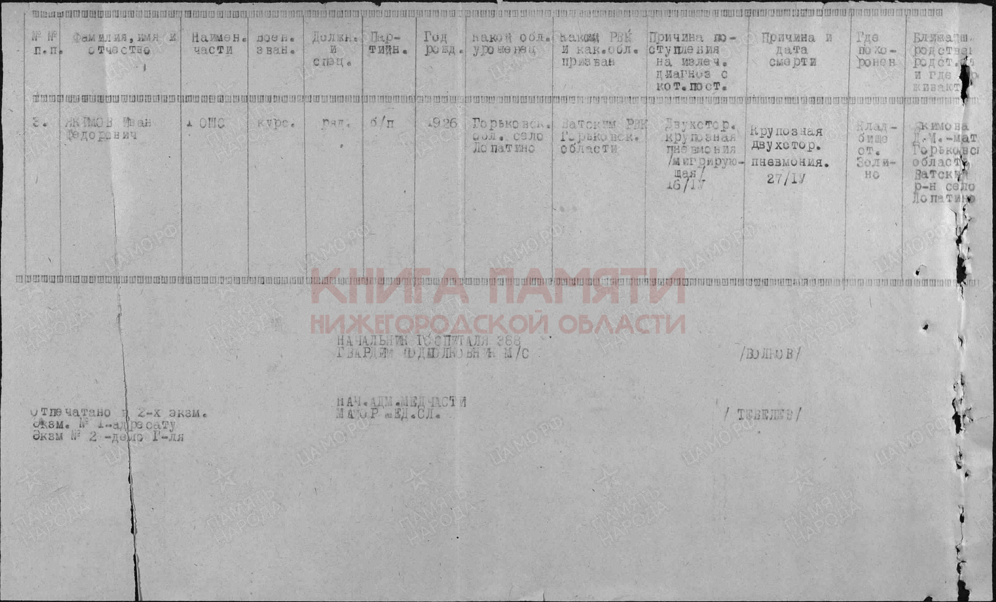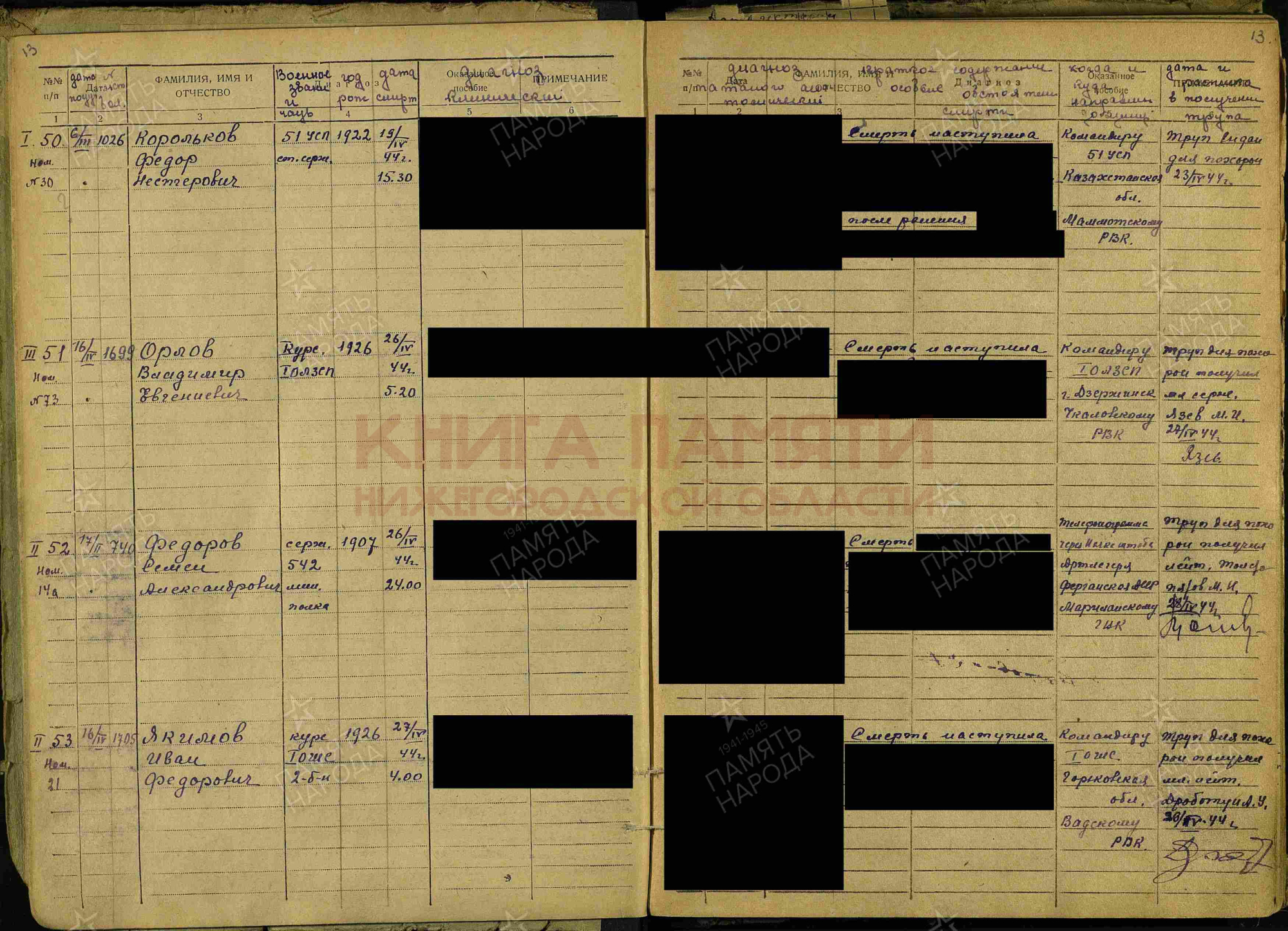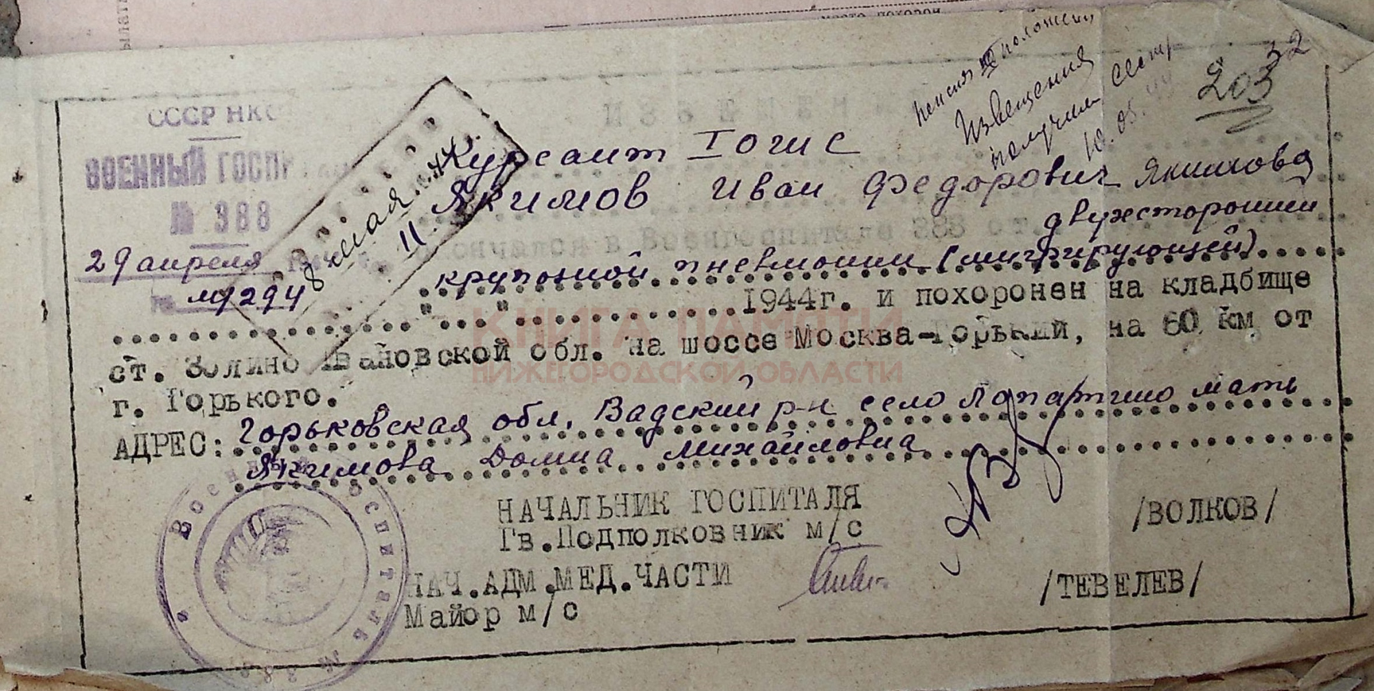 Умер от ран 27 апреля 1944 г. Место захоронения Ивановская обл., Гороховецкий р-н, ст. Золино, кладбище ;
