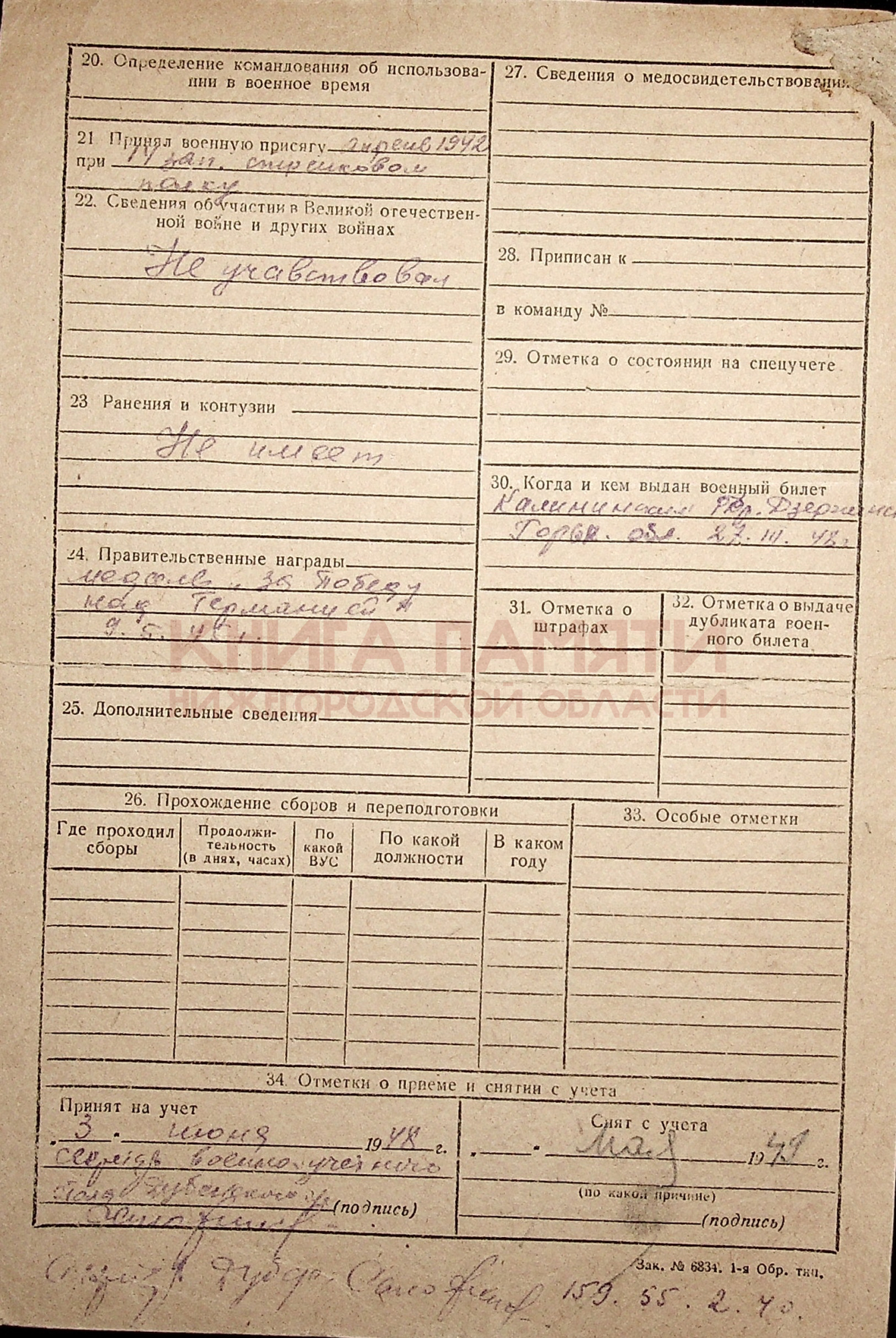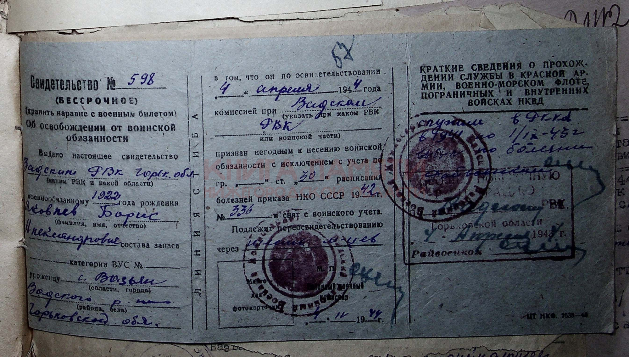04.04.1944 г. признан негодным к несению воинской обязанности с исключением с учета.