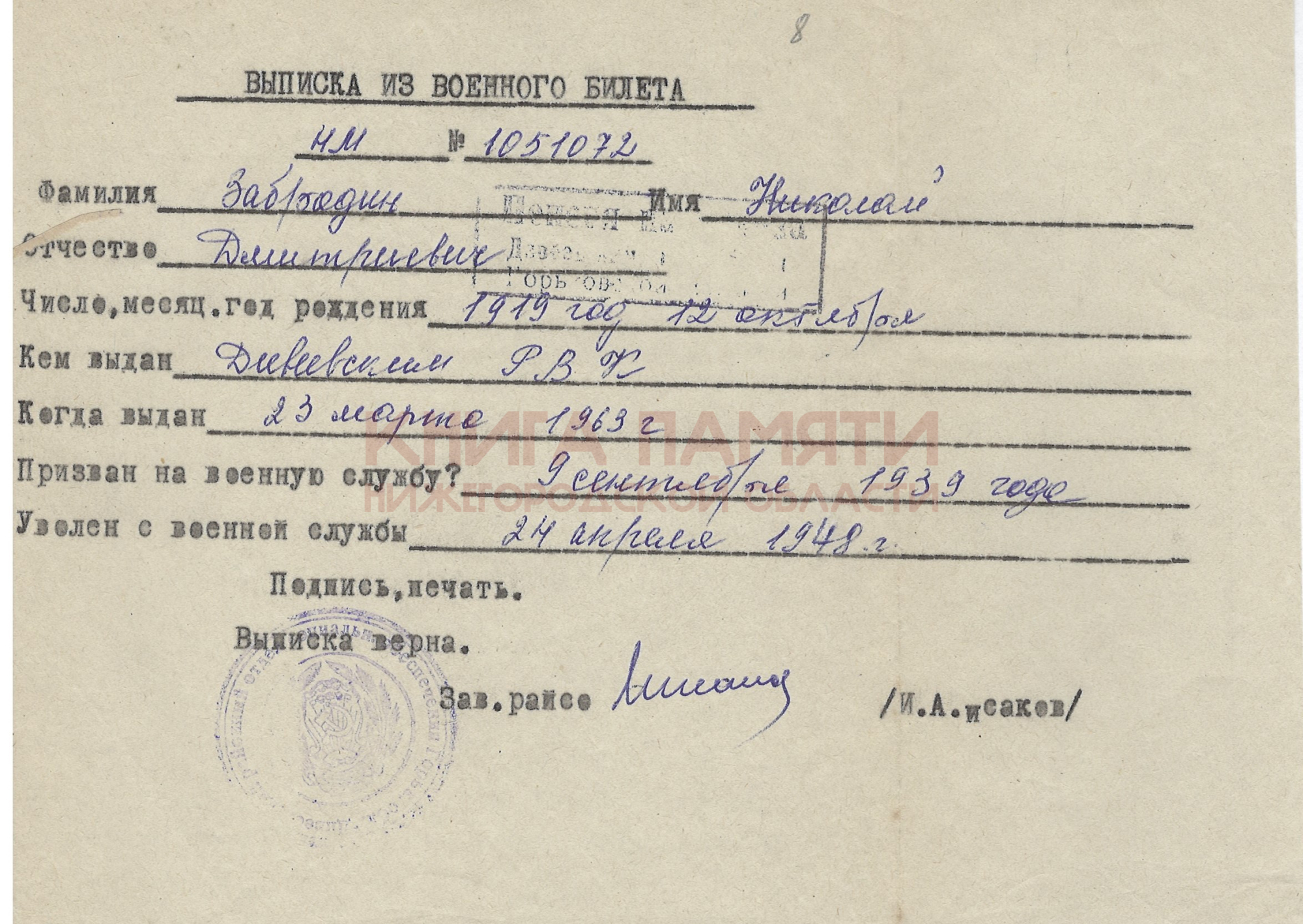 Демобилизован 24.04.1948г. Проживал в с.Дивеево Дивеевского района. С октября 1962 года до выхода на пенсию работал лесником в Дивеевском лесничестве. Умер 29.06.1995г.