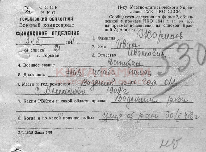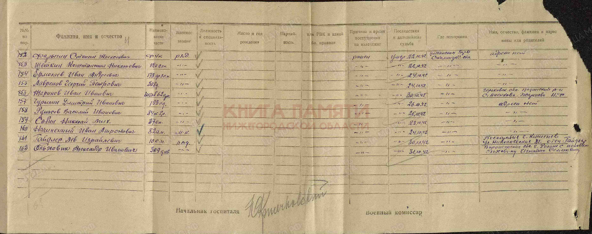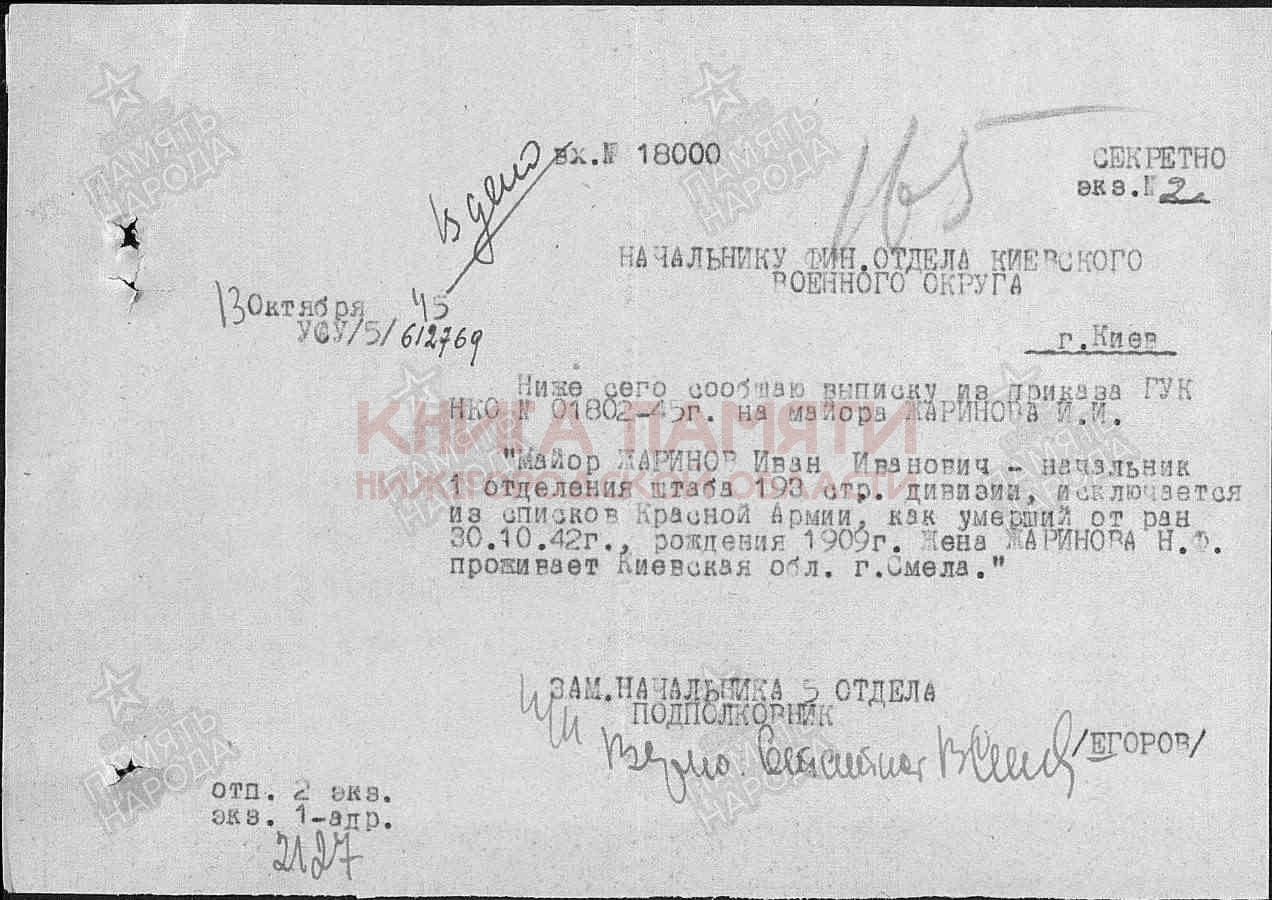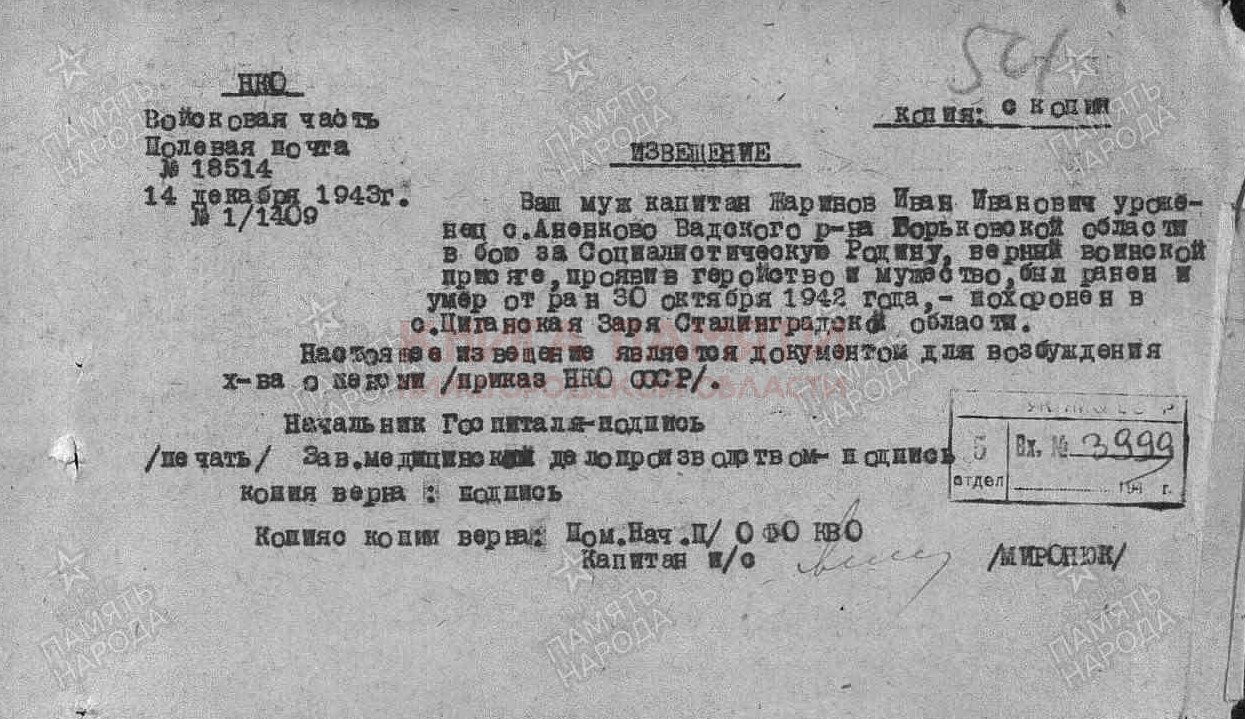 Умер от ран 30 октября 1942 г.