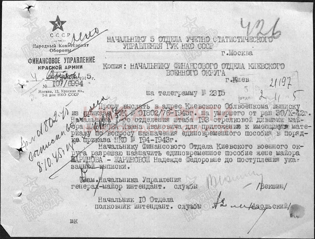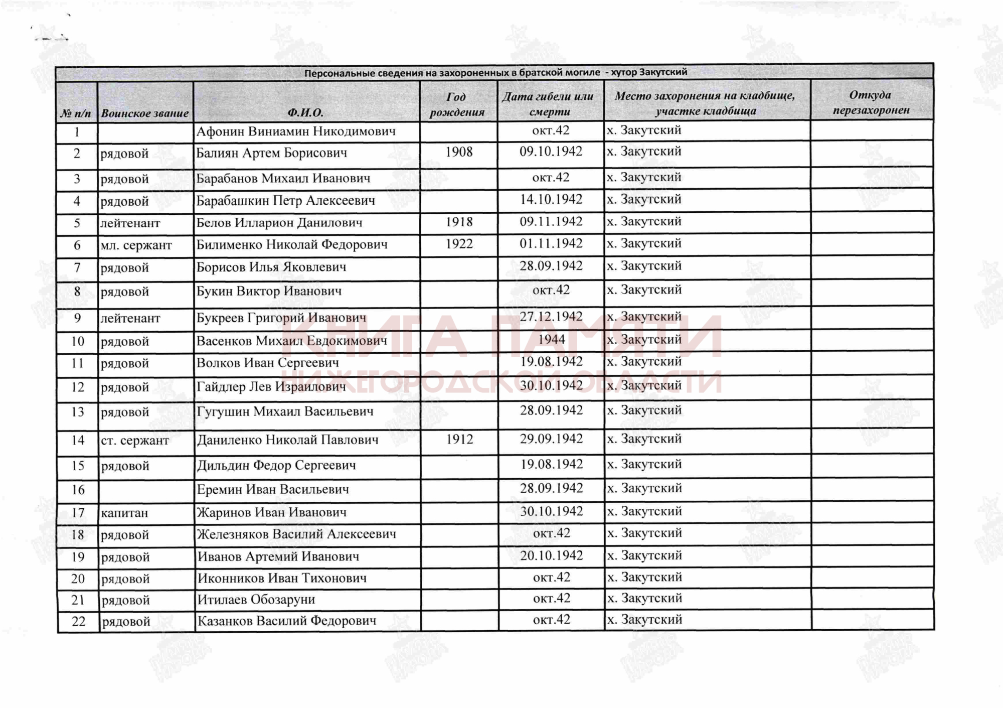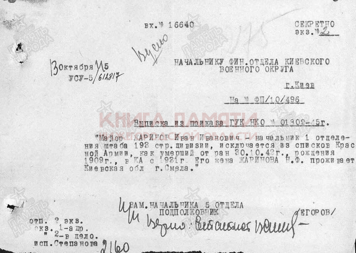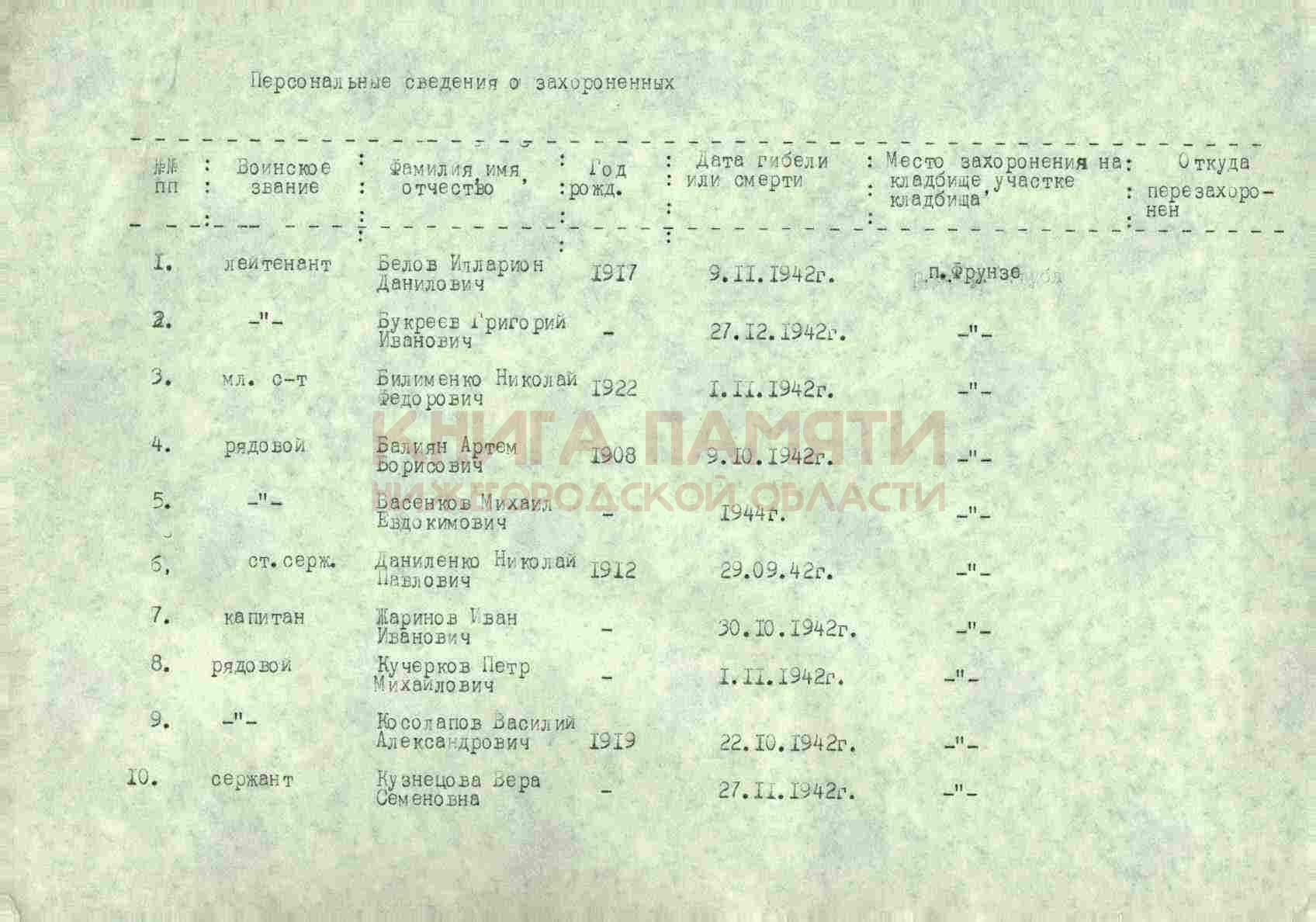 Умер от ран 30 октября 1942 г.