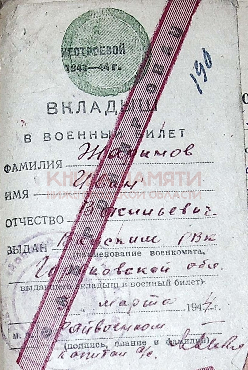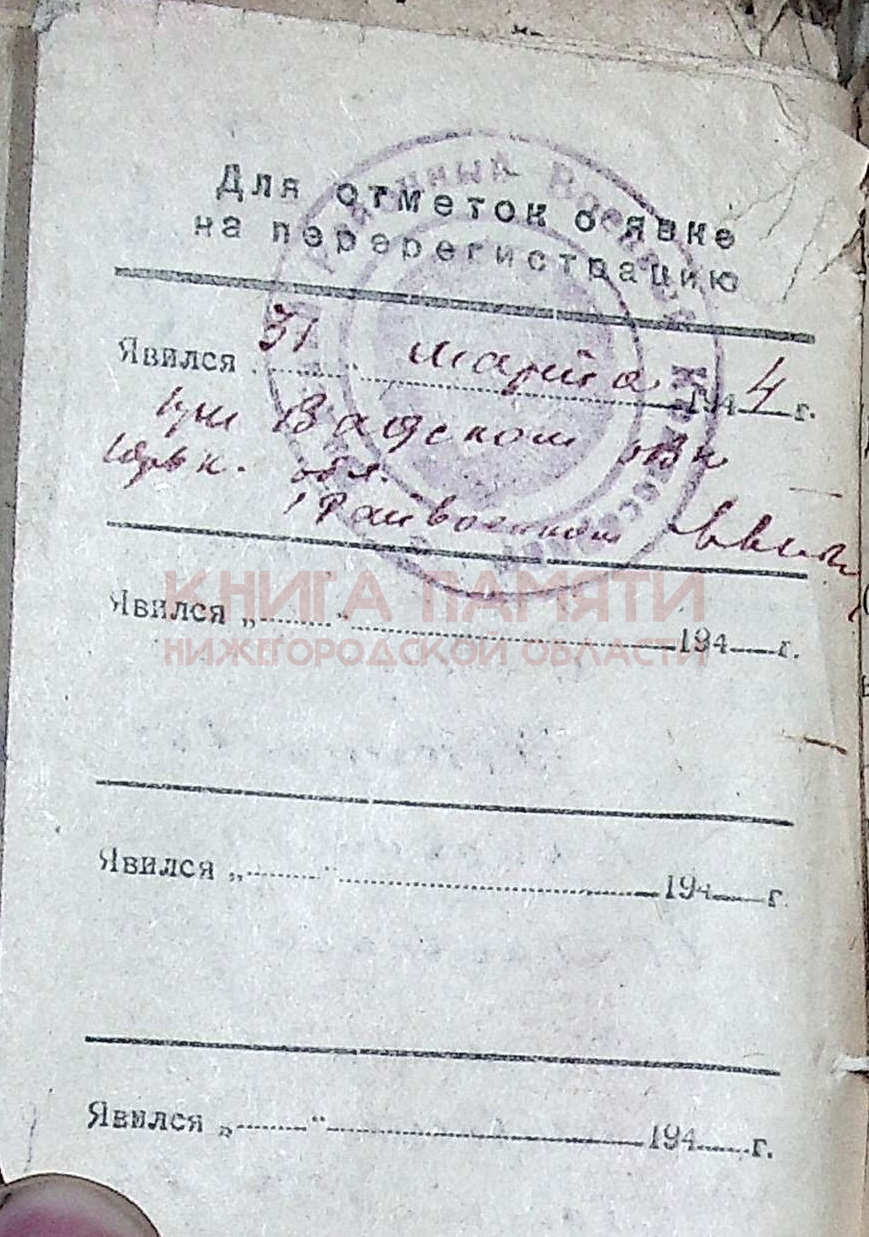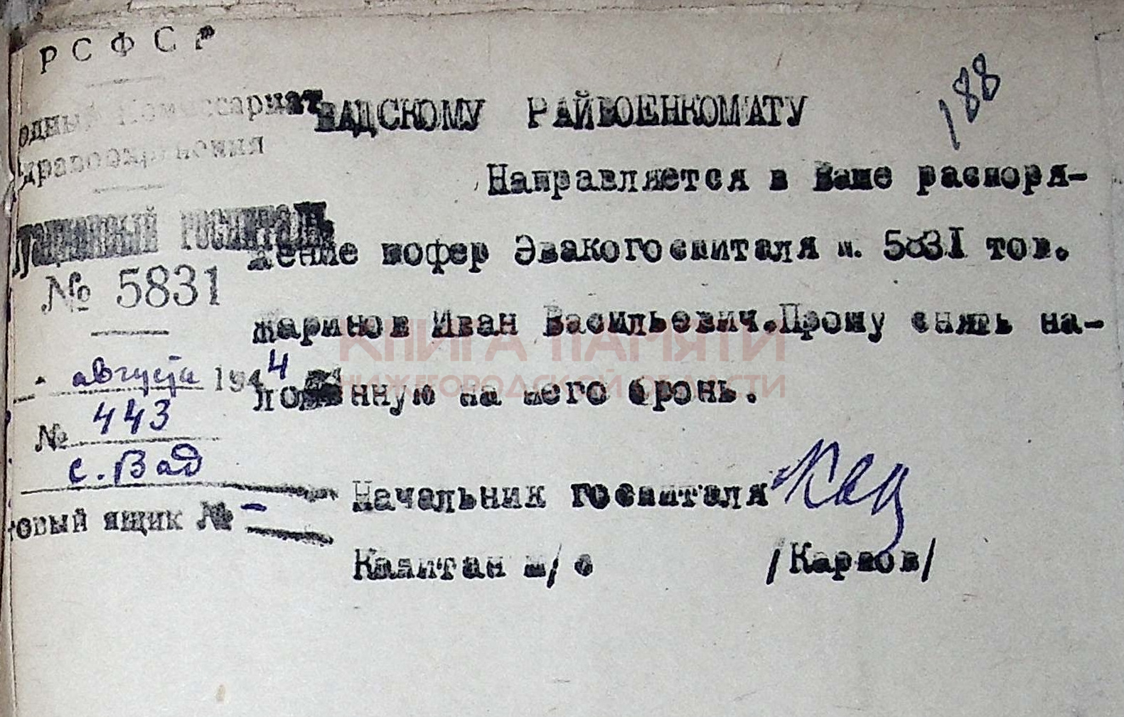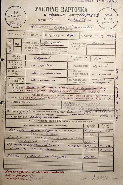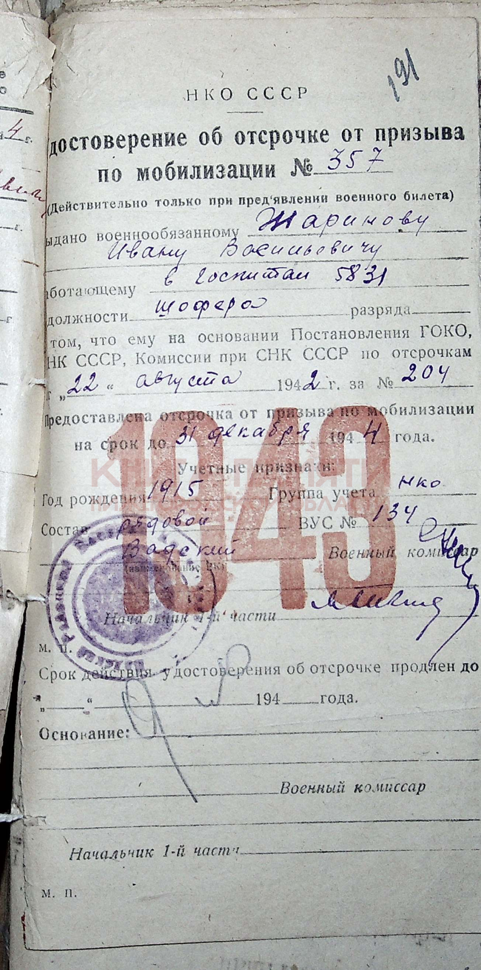 Шофер эвакогоспиталя с 22.09. 1942 по 31.12.1944 год
