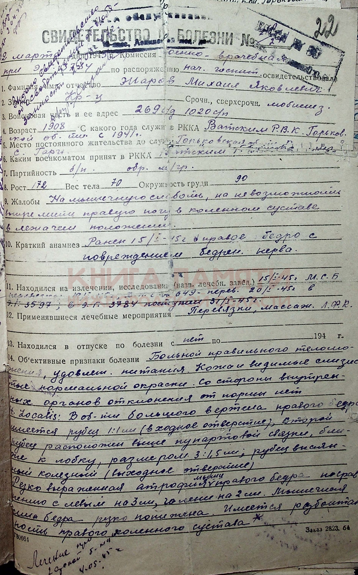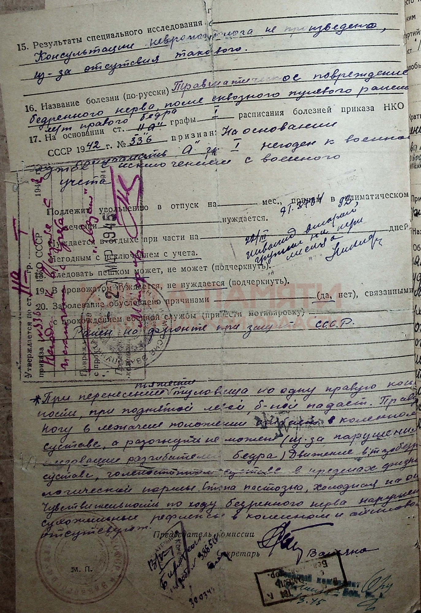 Ранен 15.01.1945 г., снят с воинского учета. 29.03.1945 г. выбыл домой.