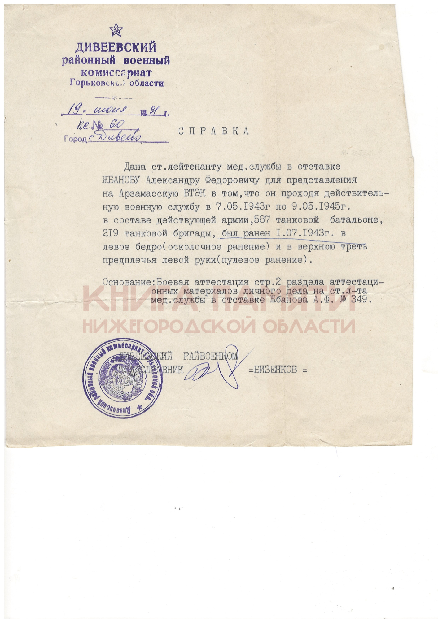 Был ранен 01.07.1943г. в левое бедро (осколочное ранение). Демобилизован 09.05.1945г. Проживал в пос. Сатис Дивеевского района, работал в Сатисской участковой больнице.Умер 01.12.1992