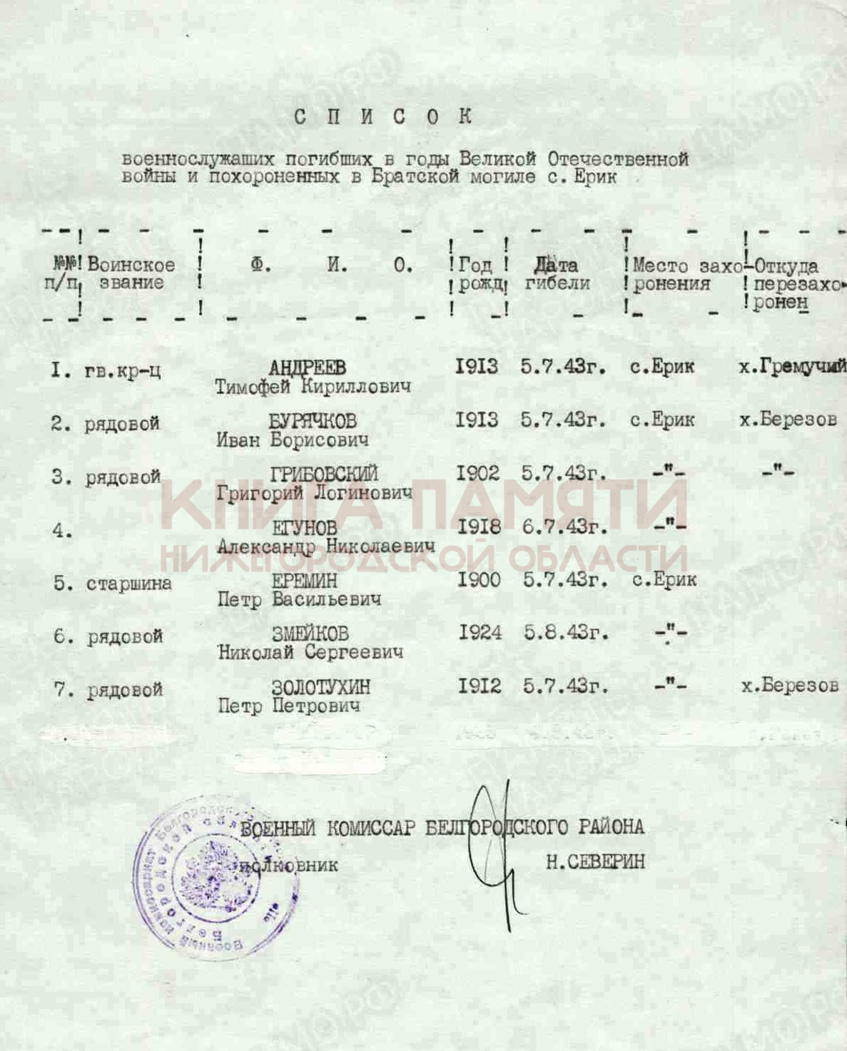 Похоронен в дер. Ерип Белгородского р-на, 100 м. от школы, братская могила Курской обл.