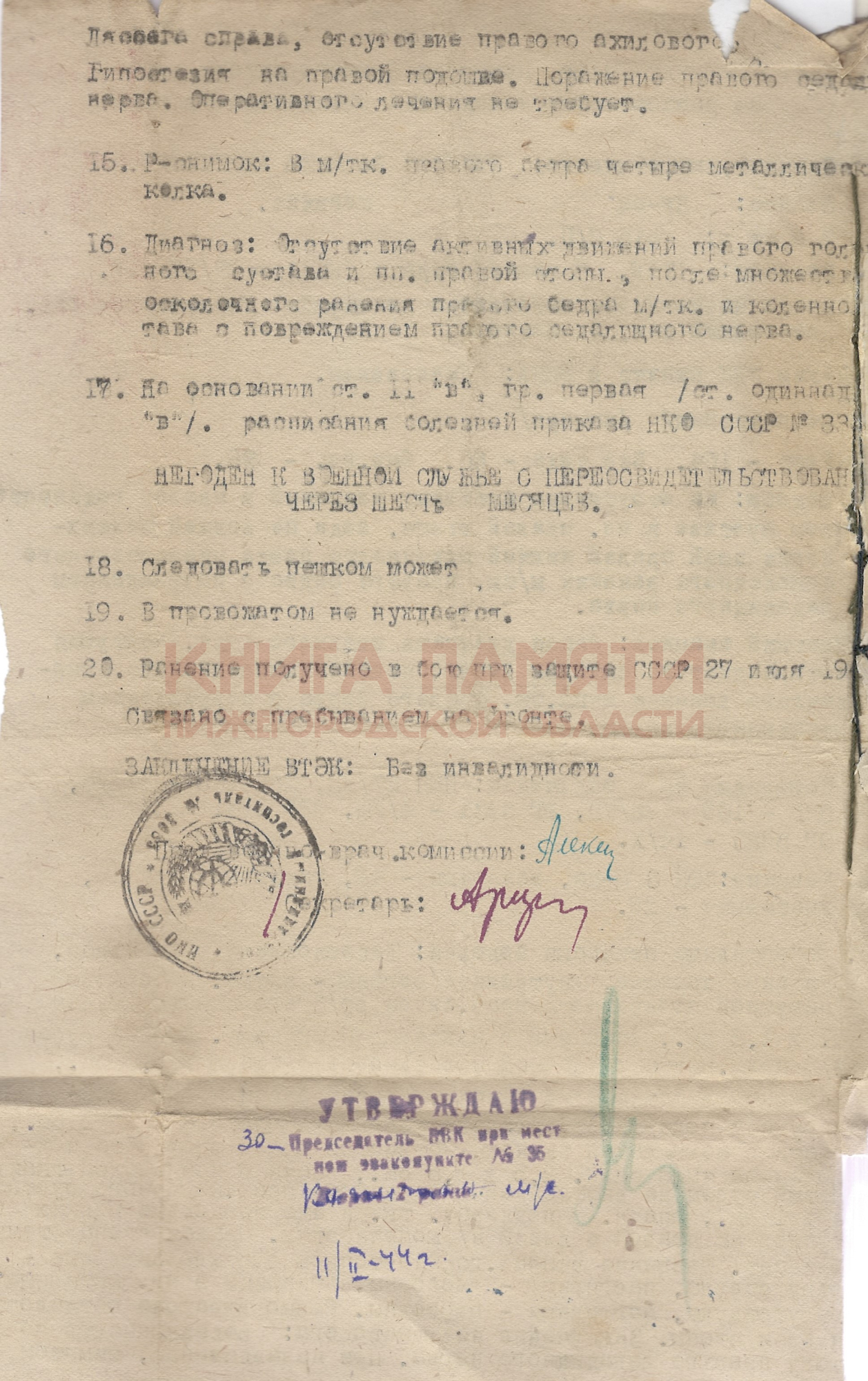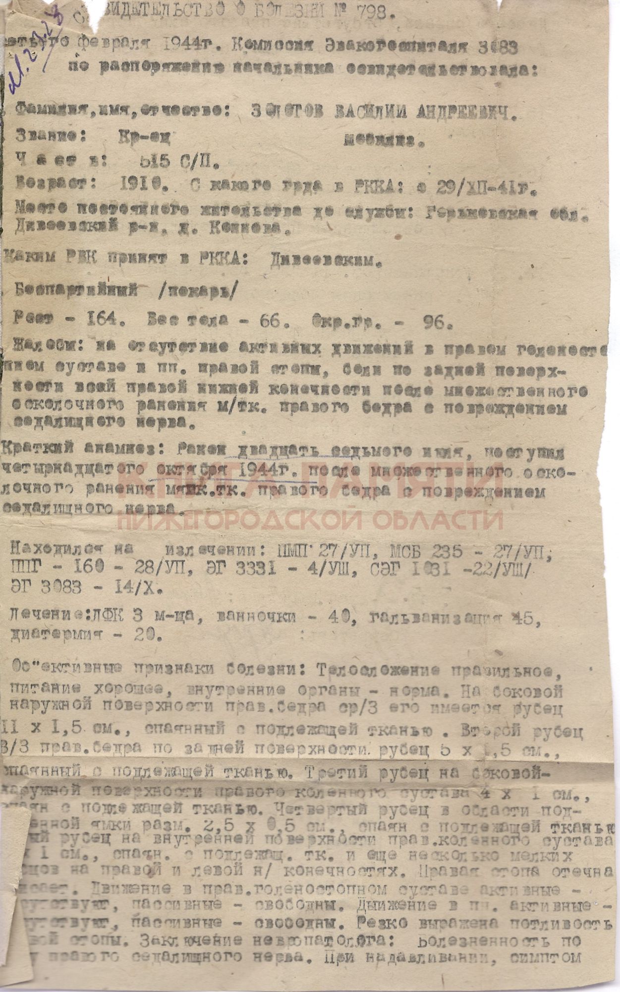 Инвалид ВОВ 1 группы. Ранен 27.07.1943 г. Осколочное ранение в правое бедро, находился на излечении- ПМП 27/УП, МСБ 235-27 УП, ППГ-160-28/УП, ЭГ3331-4/УШ, СЭГ 1031-22/УШ, ЭГ 3083.11.02.1944 признан негодным к несению военной службы.Проживал в д.Конново Дивеевского района, работал в Конновском колхозе рядовым колхозником, пчеловодом.. Умер 16.08.1999 г.