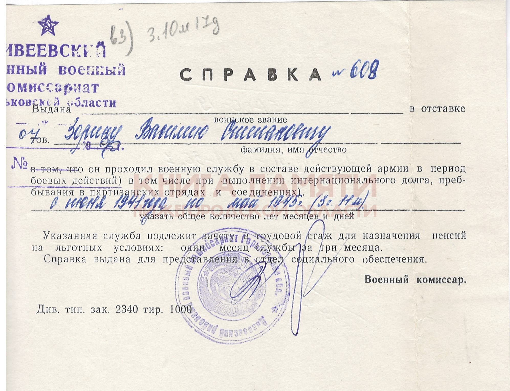 Инвалид ВОВ 3 группы, ранение на фронте. Демобилизован 26.12.1945 г. Проживал в с.Суворово Дивеевского района, работал в Суворовском колхозе.Умер 27.02.1995