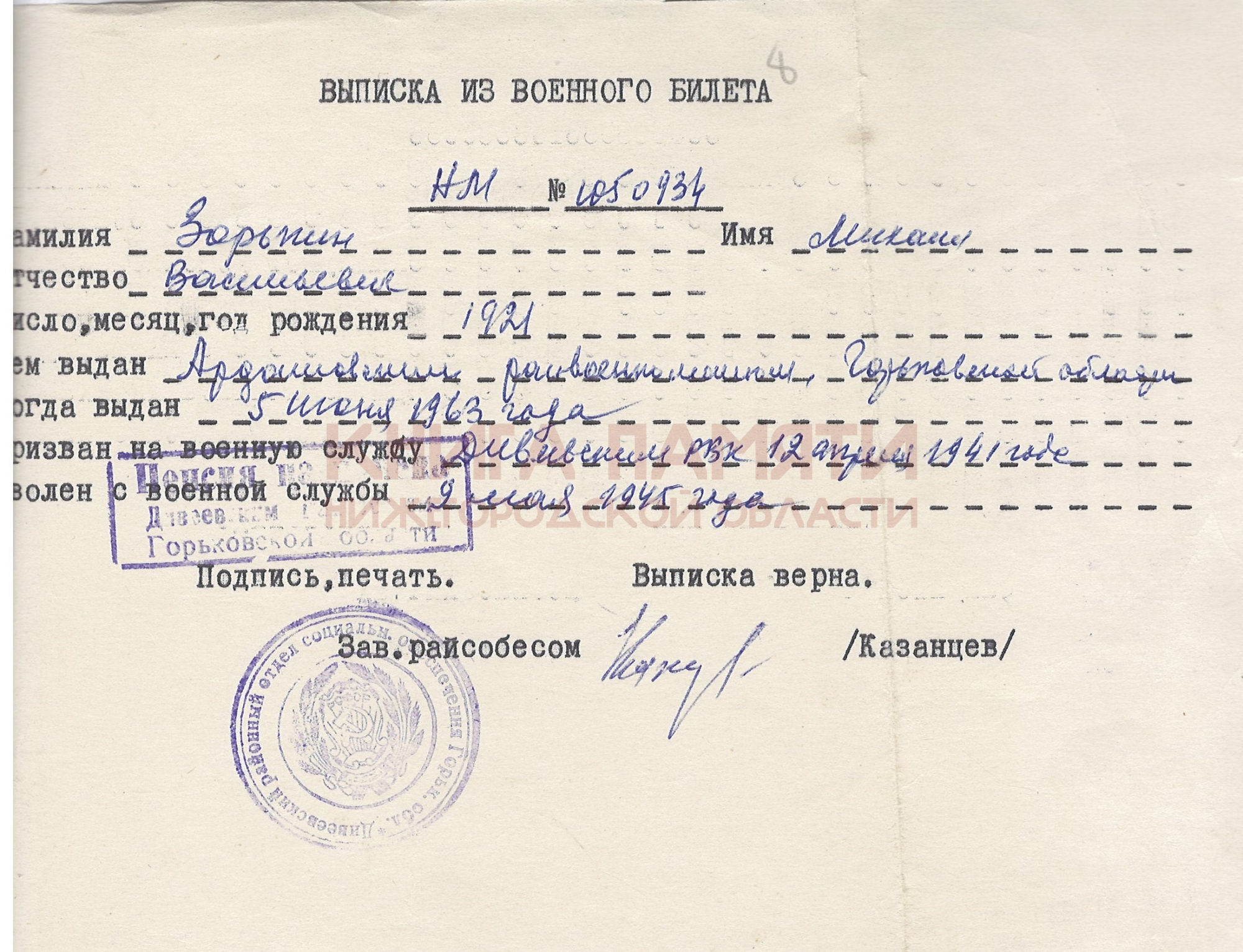 Демобилизован 09.05.1945г. Проживал в д.Осиновка Дивеевского района. Умер 29.04.1997г.