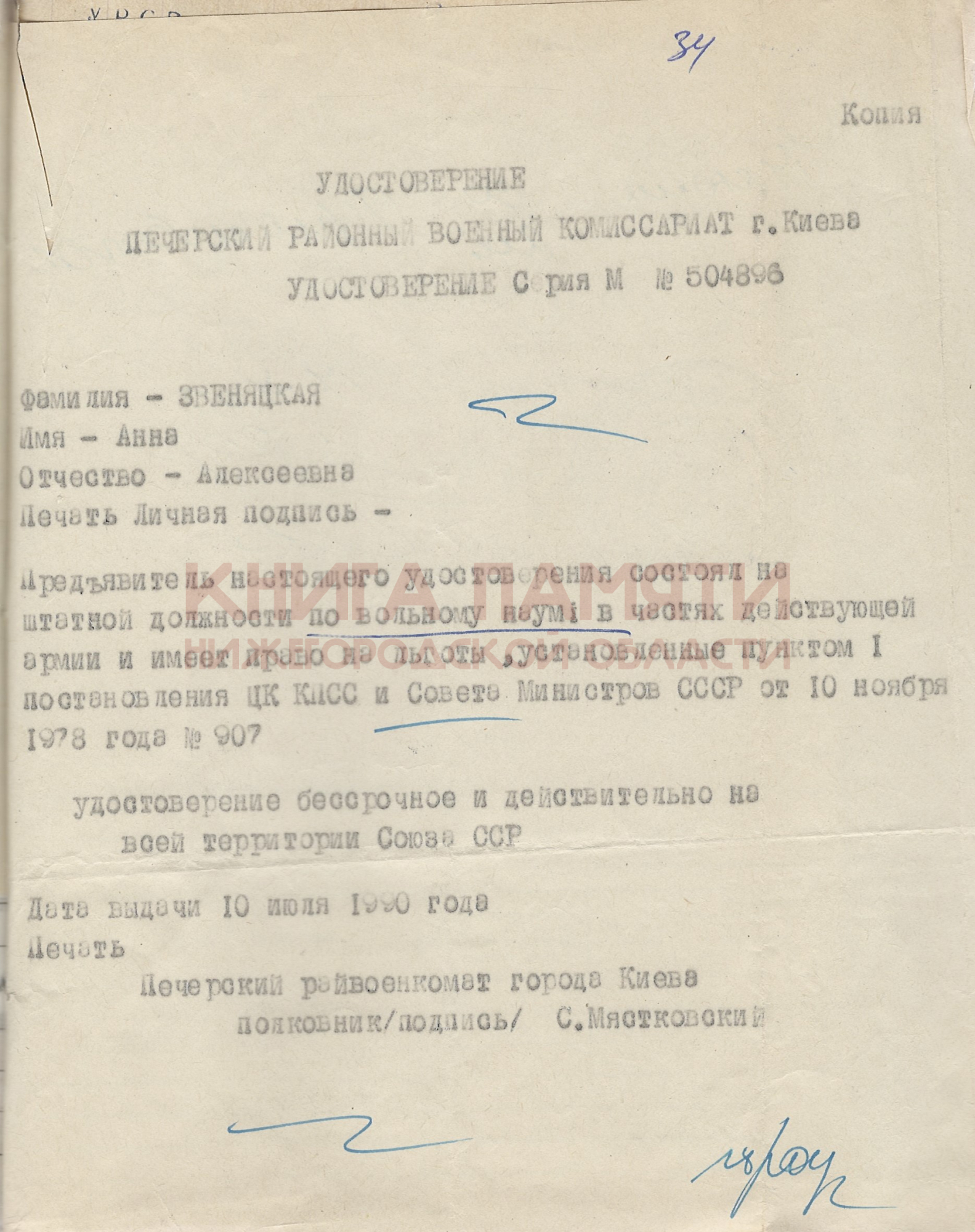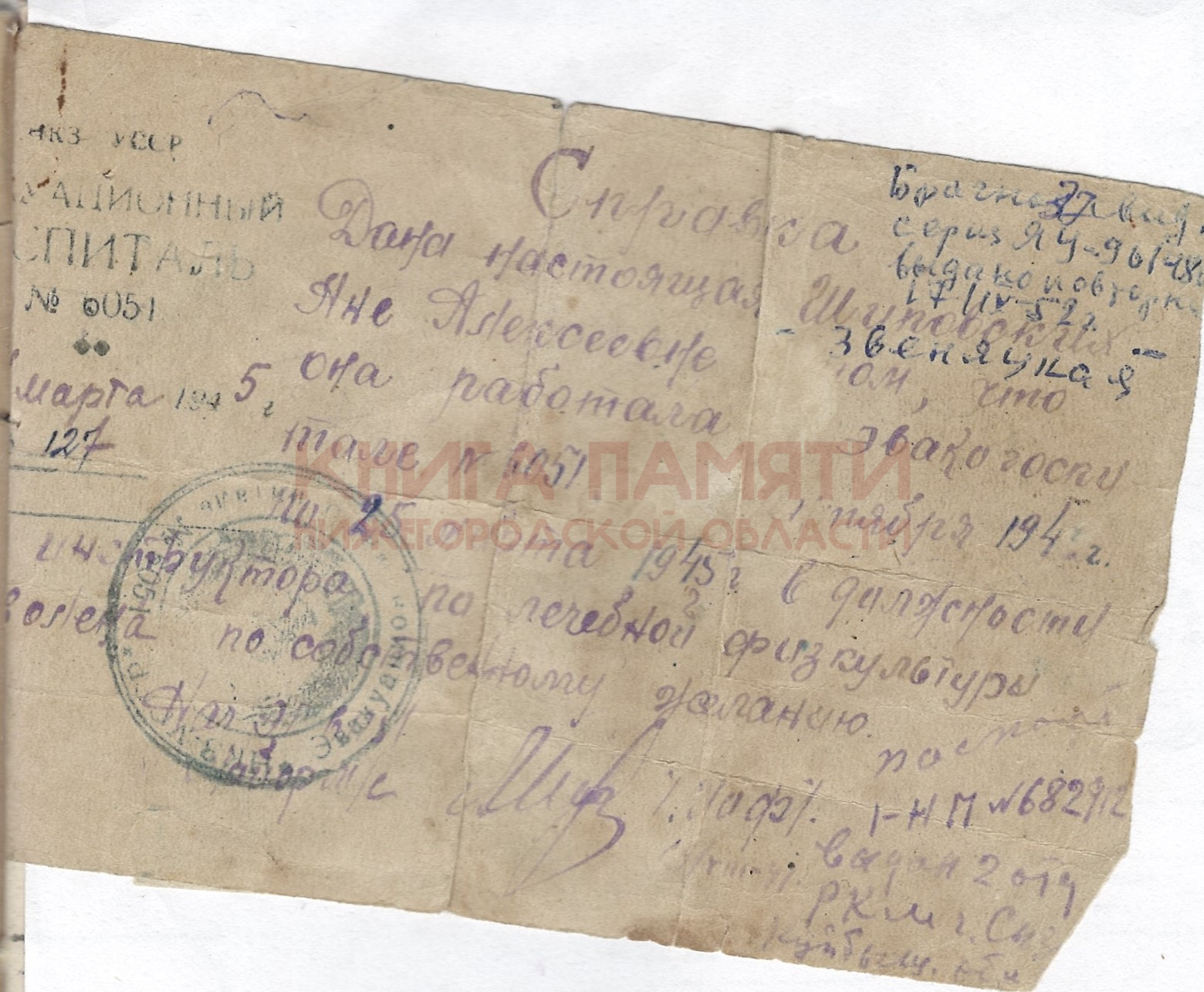 Во время войны с сентября 1943 года по 25 марта 1945 года работала в ЭГ 6051 работала в должности инструктора по лечебной физкультуре.После войны проживала в г. Киеве с 1945 г.по 1992 г., работала медсестро. В октябре 1992 года переехала в Нижегородскую область Дивеевского района д.Осиновка . Умерла 19.10.2015 г.